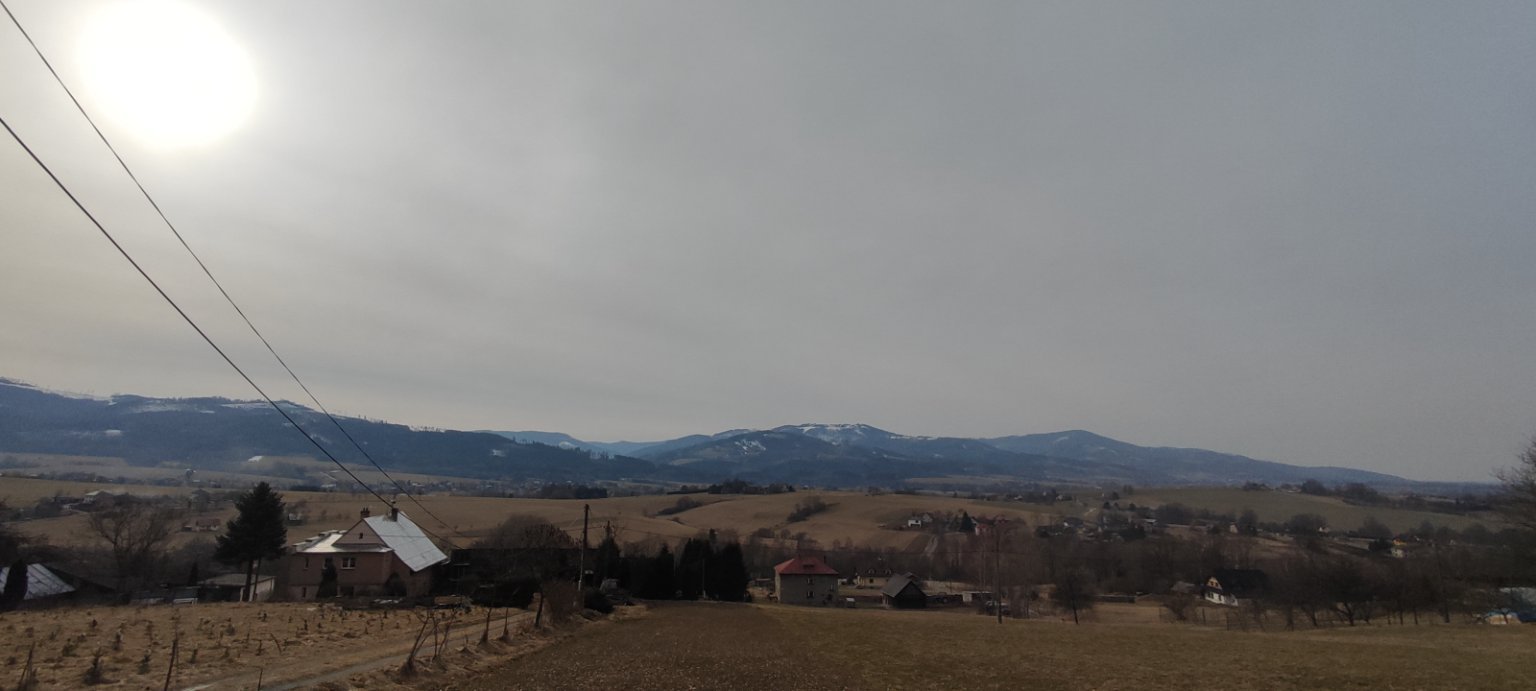-°C, Zataženo, Sníh: 0.cm. Zasněžená Polska hora Ochodzita (895.m.n.m).