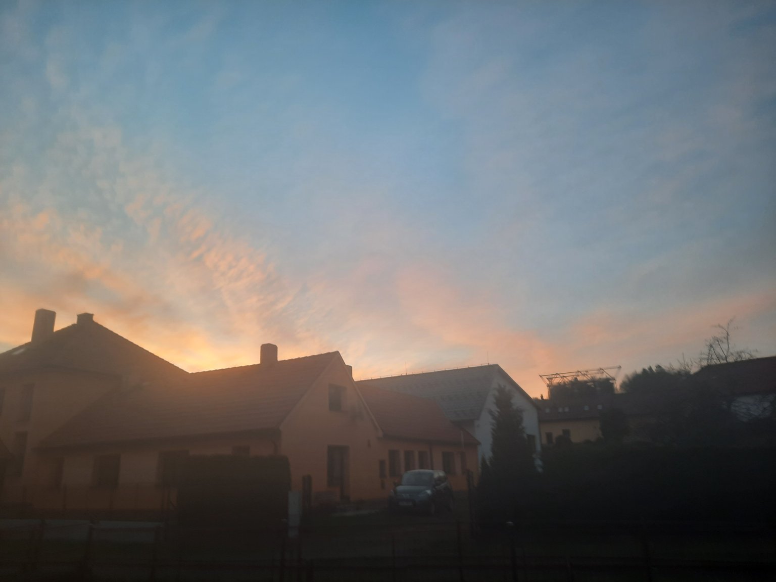 6°C, Skoro jasno až polojasno. Východ slunce. (Posílám fotku od taty).