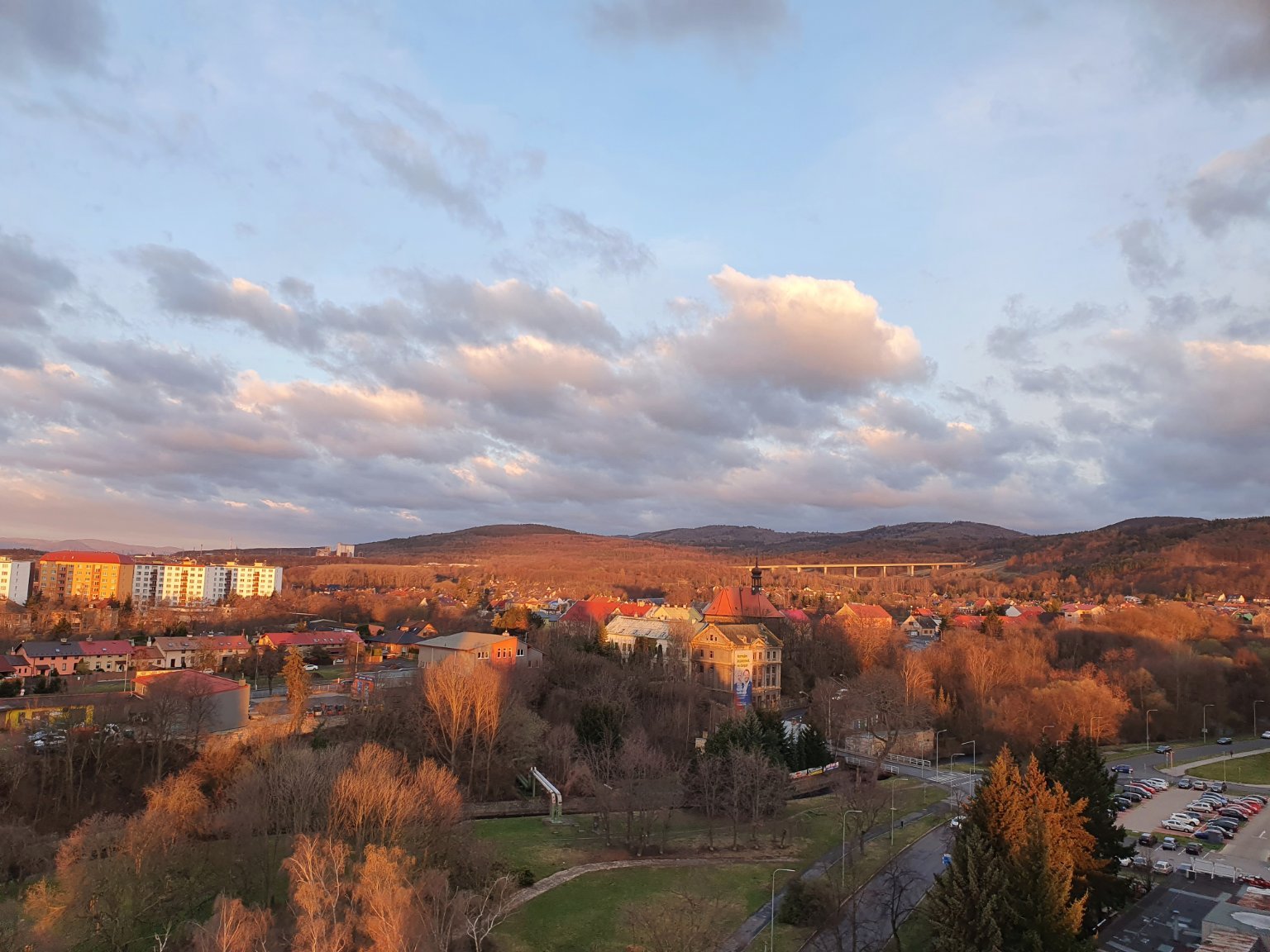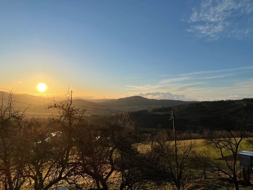 6°C, Skoro jasno až polojasno. Kupovitá oblačnost. (Posílám fotku od táty).
