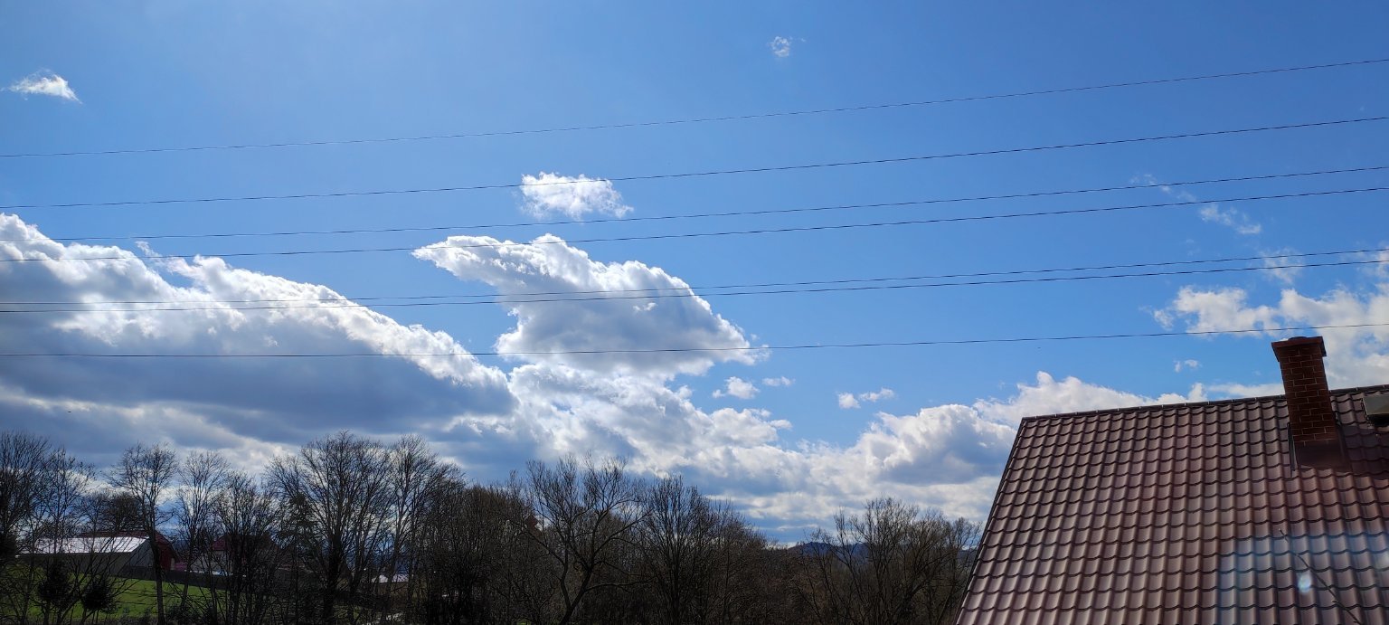 Skoro jasno až polojasno, střední a vysoká oblačnost. Vlhkost 27%, slabý vítr s nárazy do 10 m/s. Tlak pozvolna klesá. Po včerejší sérii přeháněk a i jedné bouřce je půda citelně naplněná vodou a vzduch je ještě velmi svěží.
