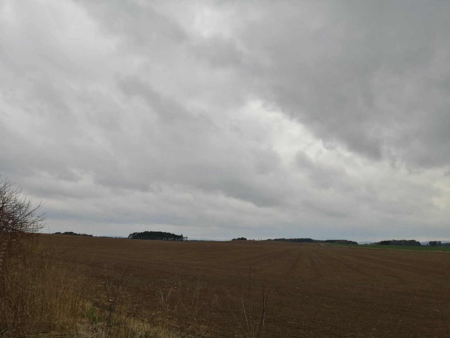 Rychlá hustá sněhová přeháňka ve městě, ukázková proměnlivá oblačnost a Z vítr
