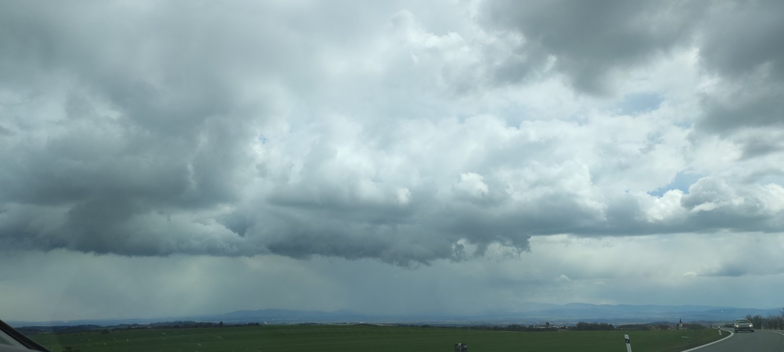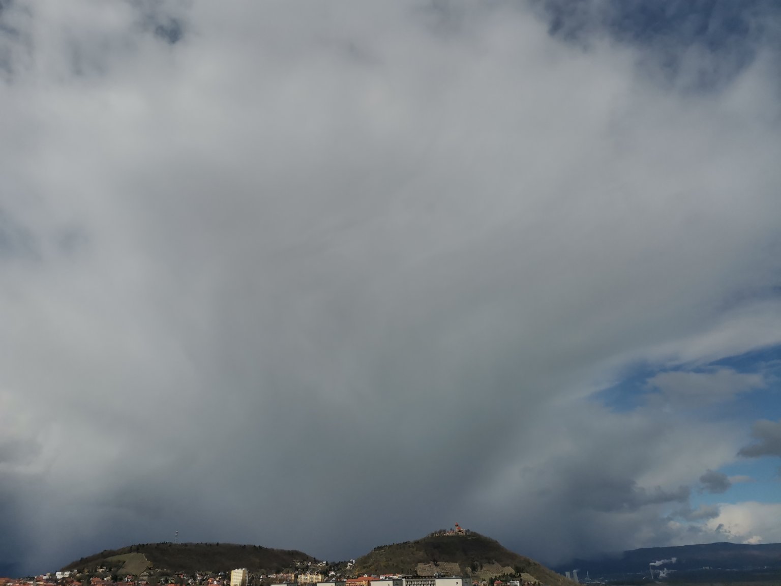 Vlhkost 46%, oblačno. Přichází silnější přeháňka, padají krupky a sníh. Zesílil vítr, nyní čerstvý s nárazy 14,8 m/s.