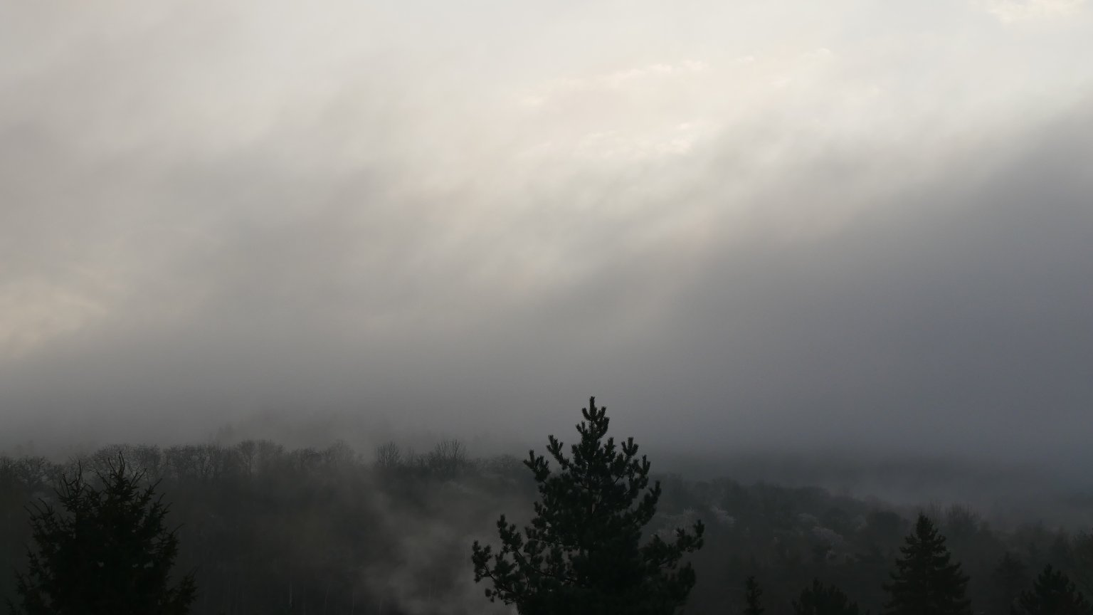 Vlhkost 49%, vítr mírný, nárazy do 5,8 m/s. Tlak klesá, peichází fronta, čelo fronty je zatím na srážky chudé, ale objevuje se zajímavě tvarovaná oblačnost.