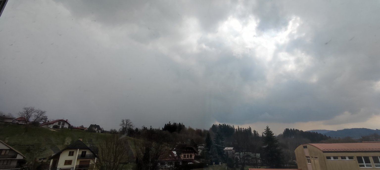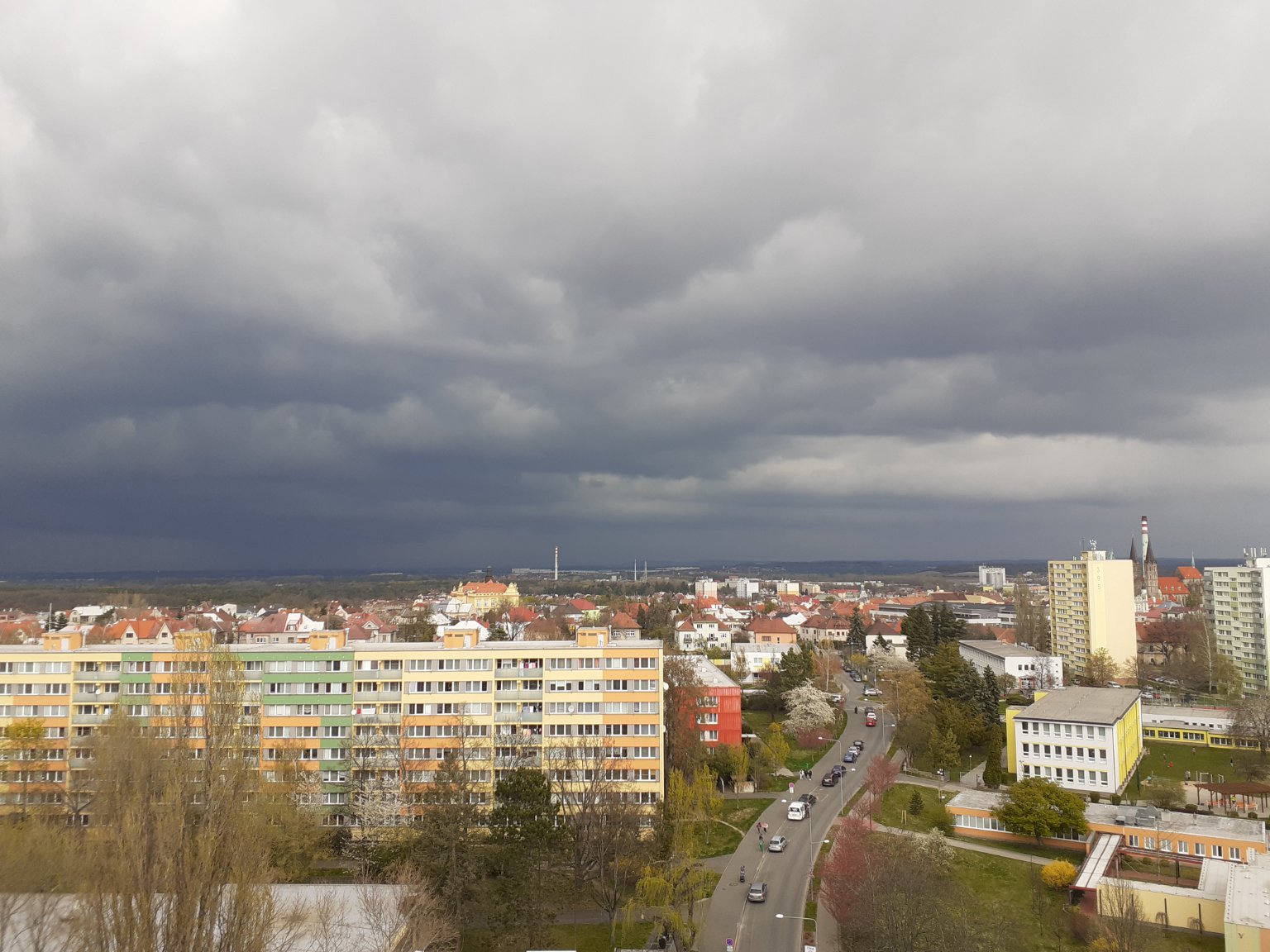 -°C, Zataženo. Vzdálená přeháňka, je na ní dokonce vidět hranice sněžení. (PS: Posílám fotku od táty).