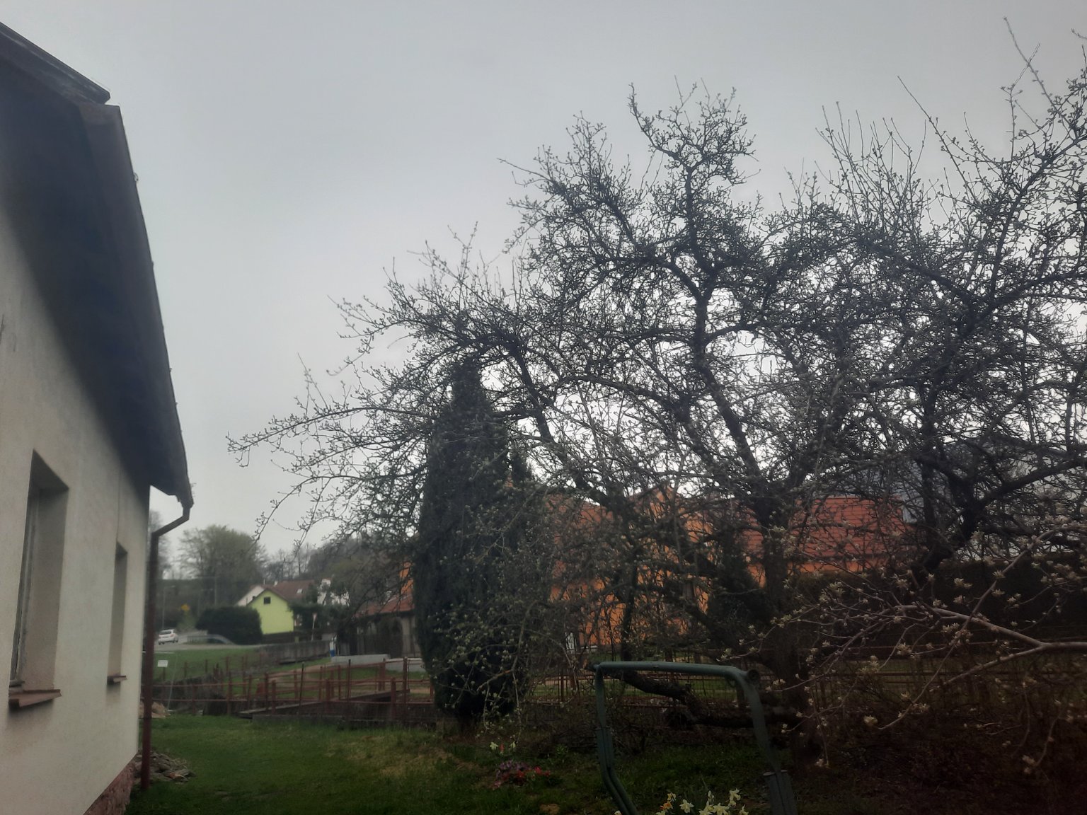 Dnes konečně nemrzlo. Teplota ráno klesla na 0,5°C. Celý den je zataženo oblačností středních pater, přes kterou chvílemi prosvítalo slunce. Nyní už neprosvítá a od jihu se blíží slabý déšť. Vane slabý severovýchodní vítr, tlak: 1005hPa.
