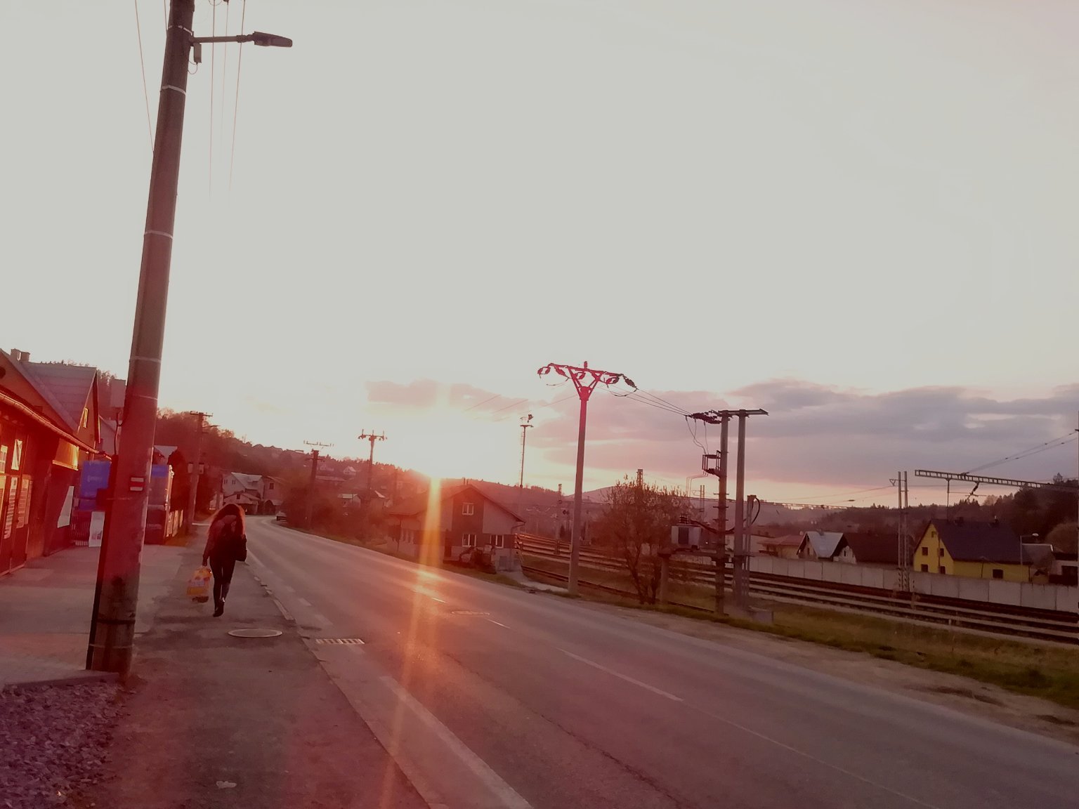 11,4°C, Polojasno. Slunce zapadá a osvětluje dům se stodolou.