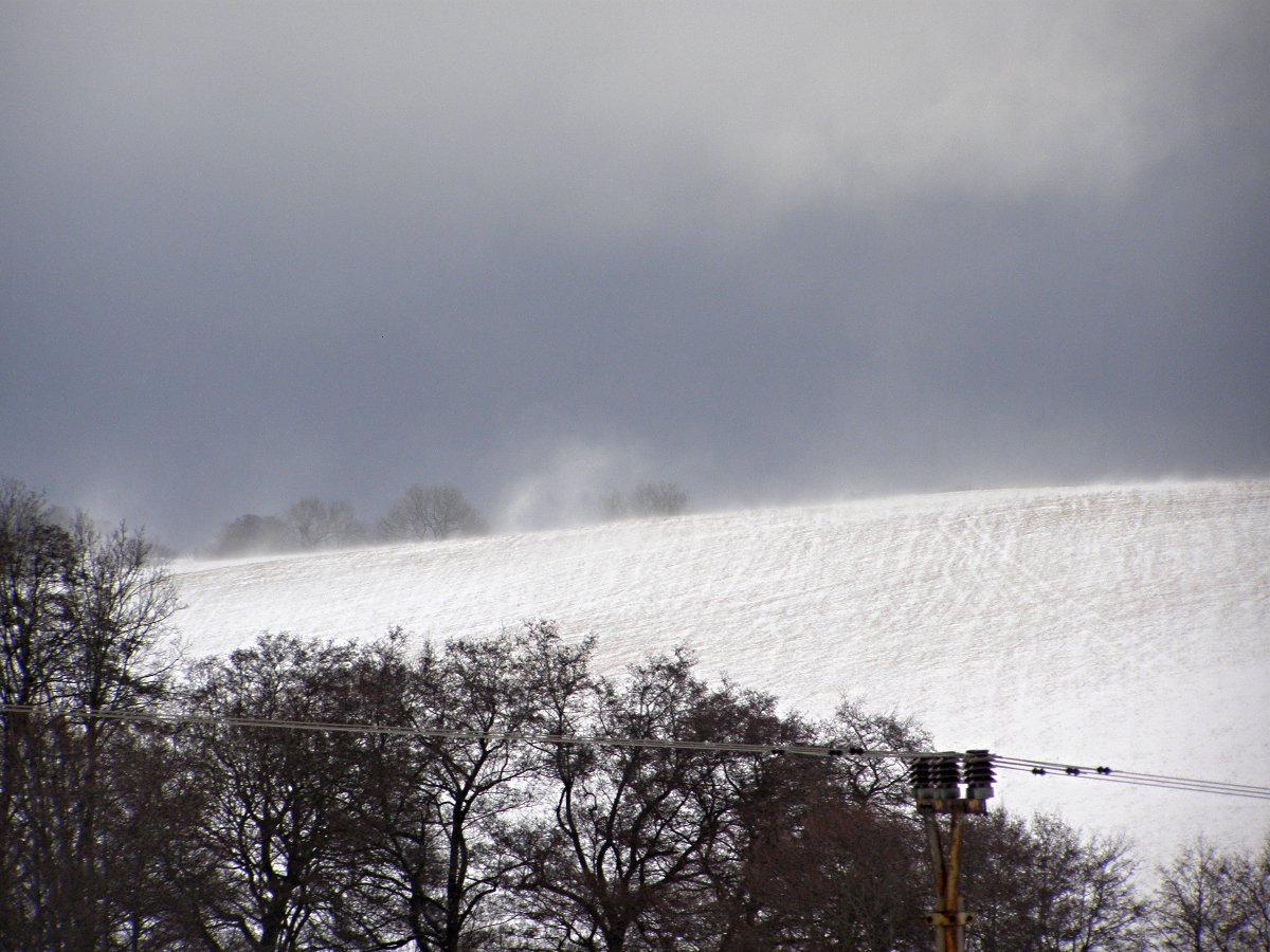Silný západní vítr, sněhový poprašek, velká viditelnost, jsou vidět Krkonoše
