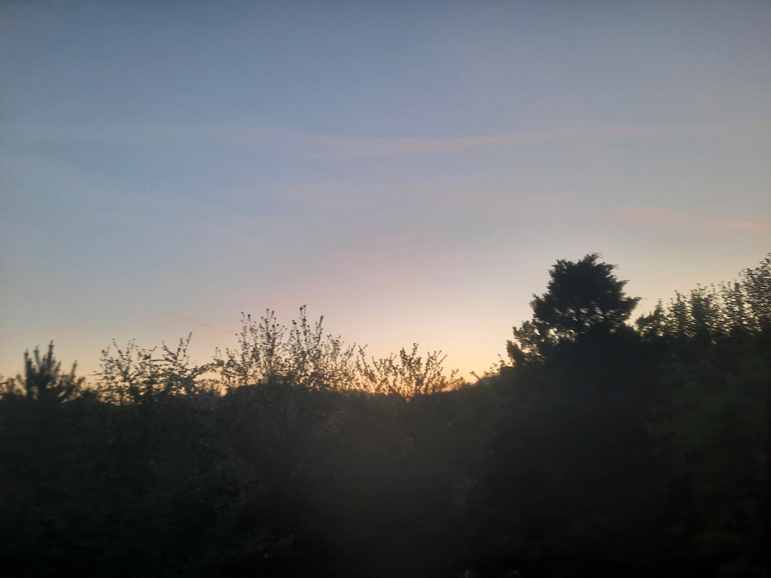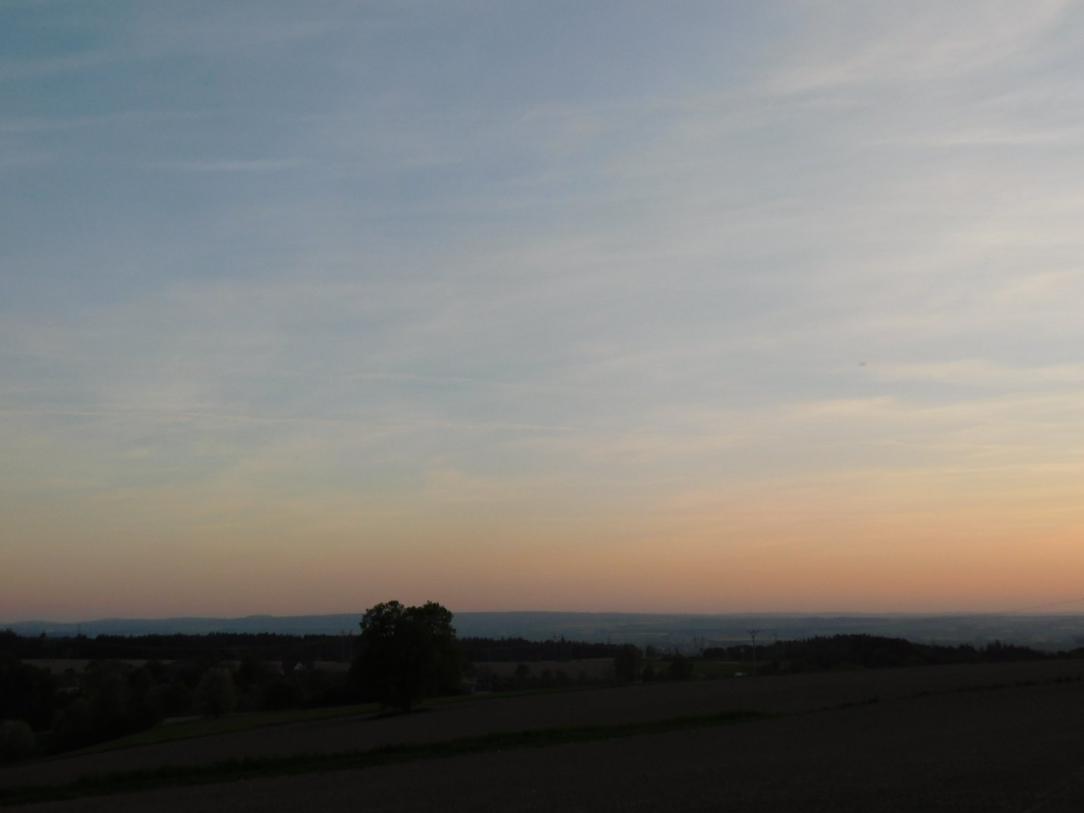 Krásný teplý podvečer, bez jediného mraku. Letadlo si to střihlo za sluncem.