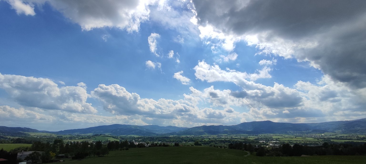 16,2°C, Oblačno až polojasno. Oblačnosti je stále dost... (PS: Omlouvám se za přepálené panorama, telefon nedokáže ztlumit jas...).