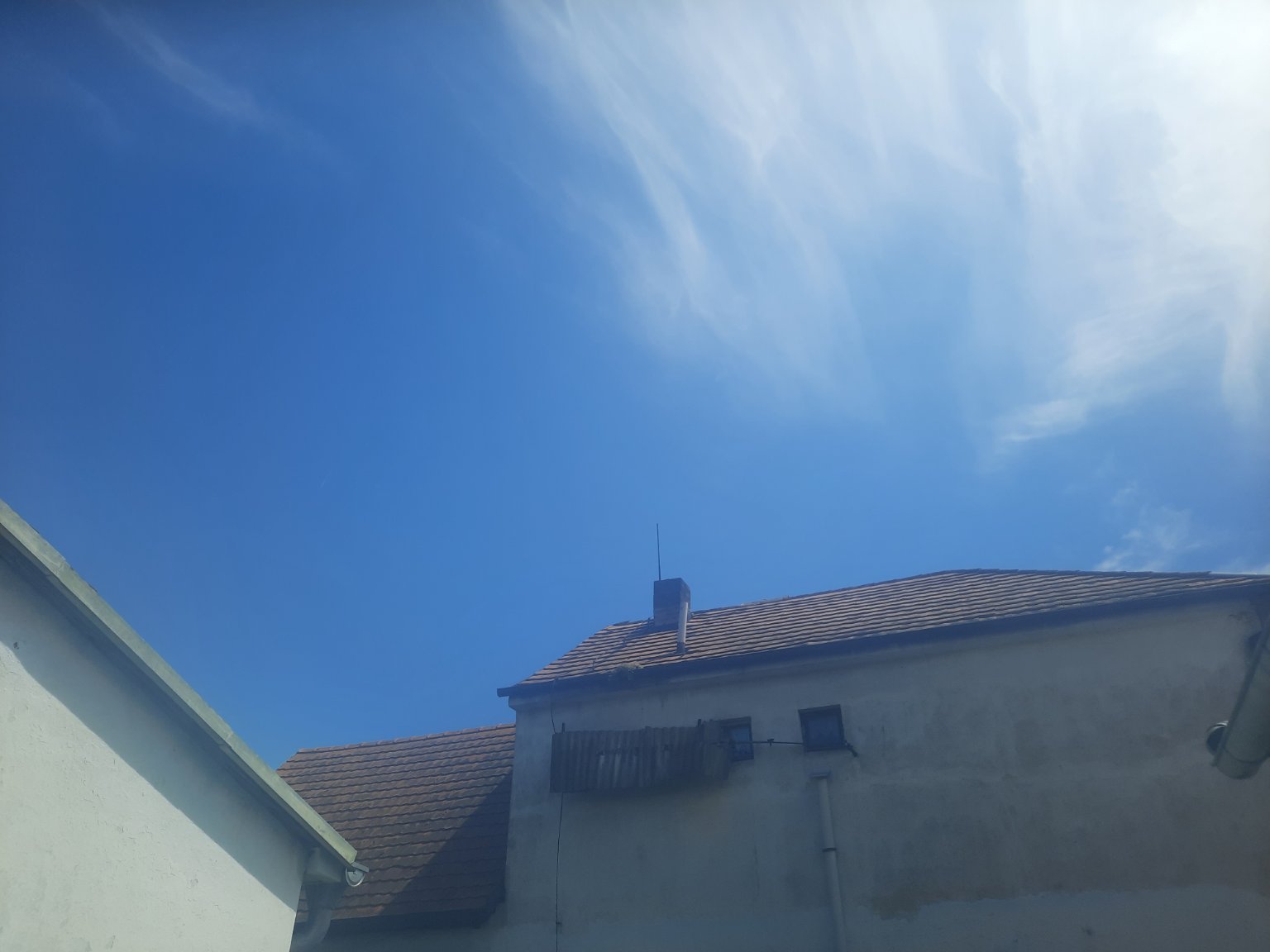 Zakalená obloha trochou saharského prachu a k tomu vysoká oblačnost. Letos poprvé je přes 35 °C. Ve stejný den to bylo i minulý rok.