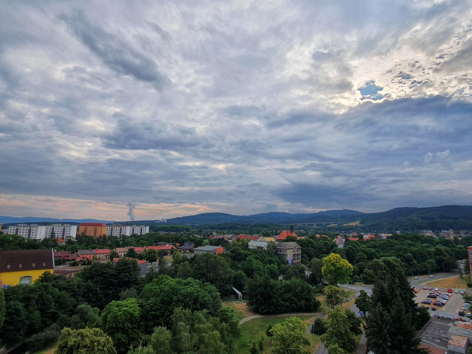 Skoro jasno až polojasno, na SV straně bouřková kovadlina, která jde bokem, takže srážky opět nehrozí, jen tiše hřmí. Vlhkost 48%, bezvětří. Přes den bylo mimořádně dusno, teď navečer je to už lepší.
