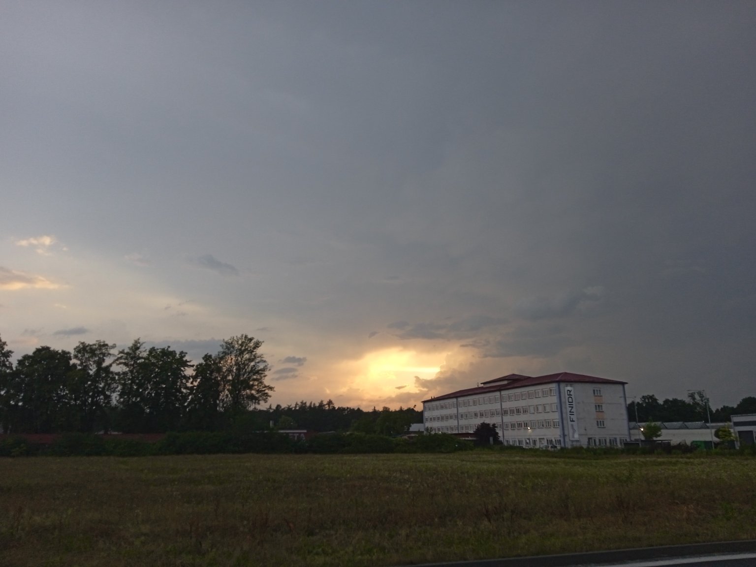 -°C, Oblačno. Západ slunce prosvítá přes bouři.