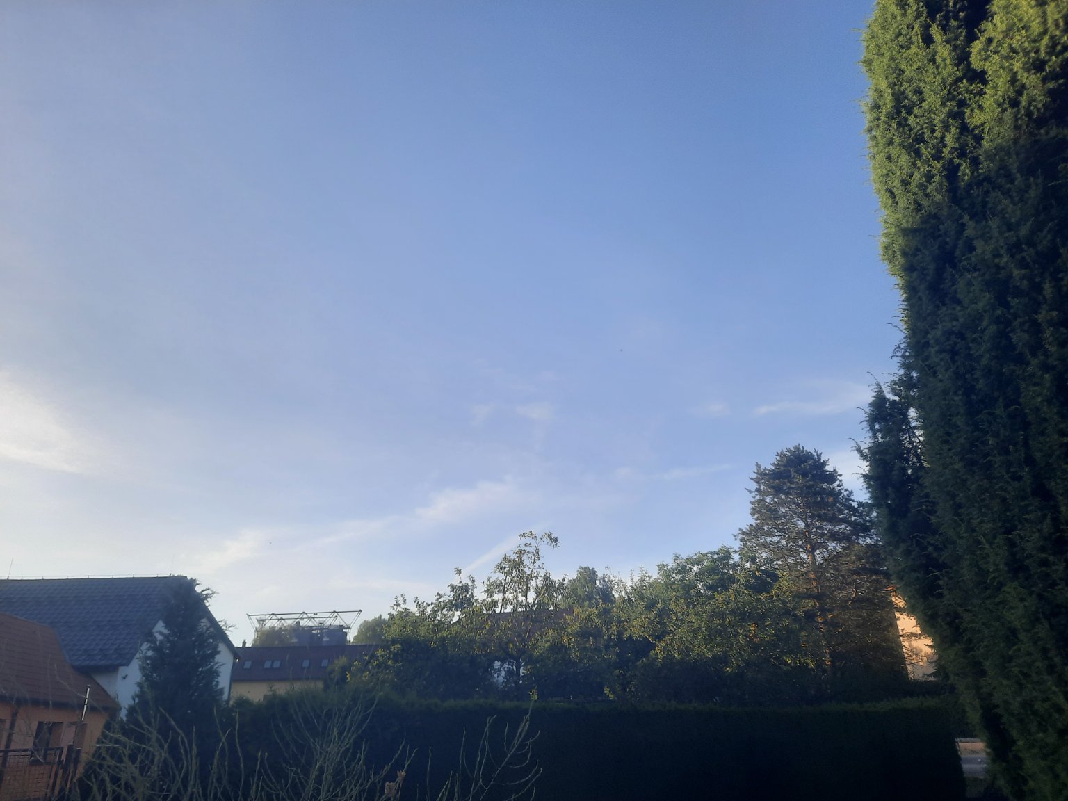 14,3°C, Skoro jasno až jasno. Dnes máme nádherne ráno s porosenou loukou.