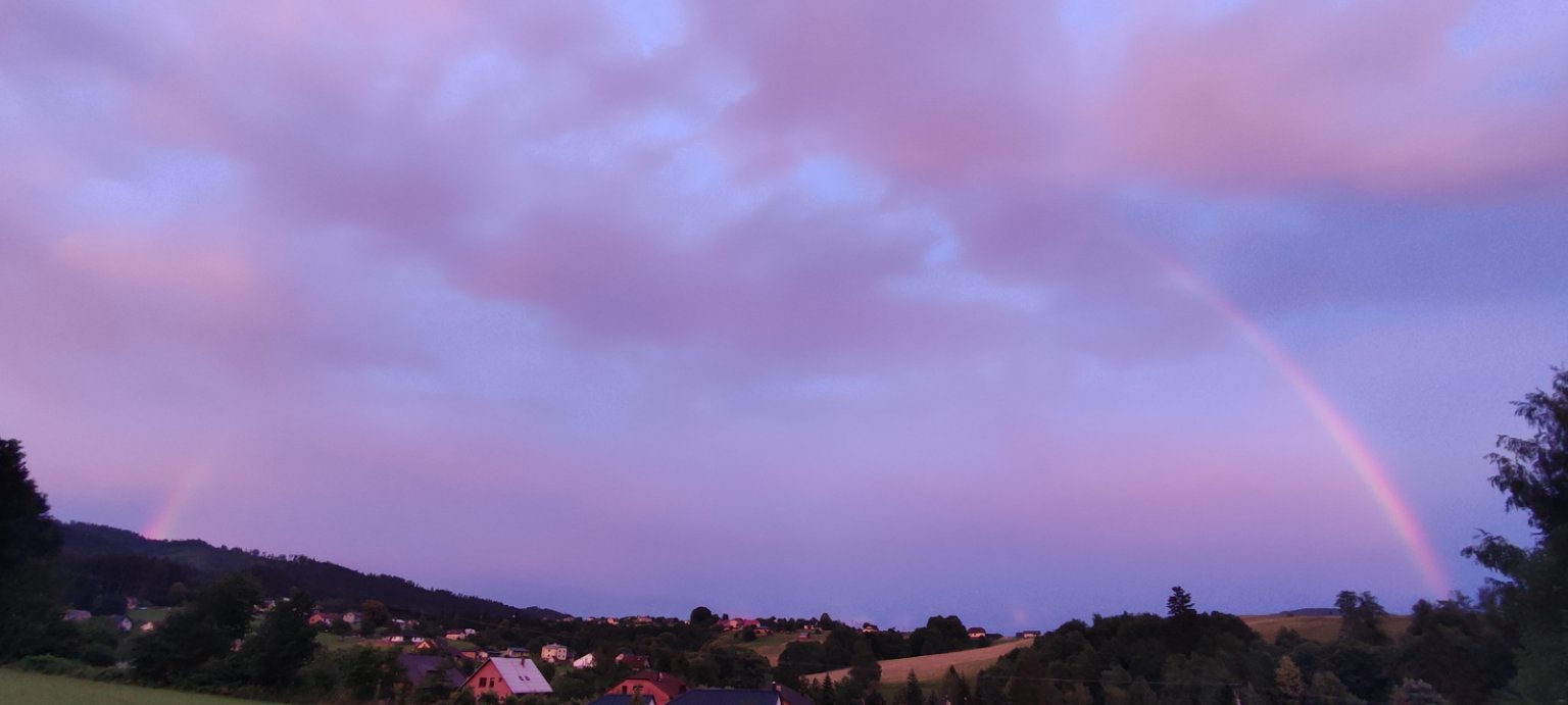 14,5°C, Zataženo, zanedbatelný dešť. Nádherná večerni rudá duha, nic takeho jsem ještě v životě neviděl!
