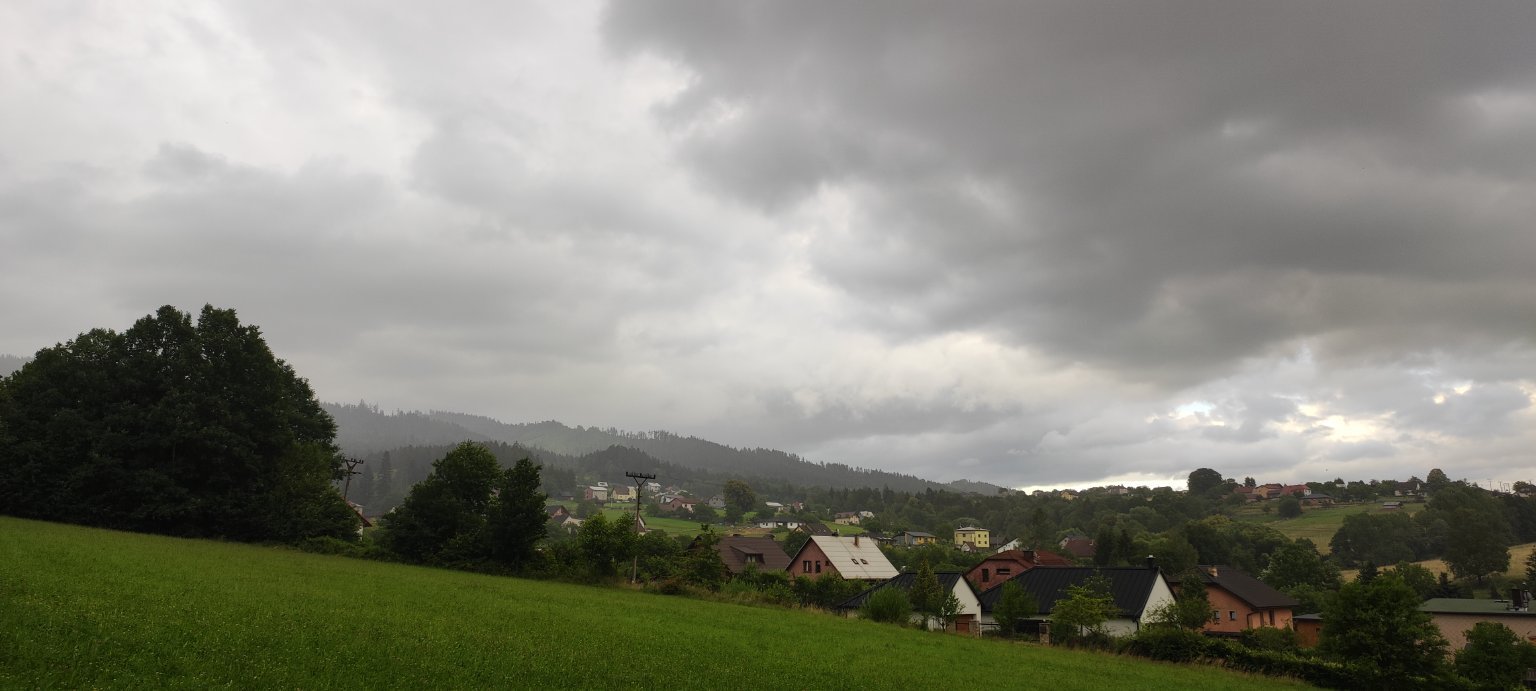 13,5°C, Slabá dešťová přeháňka. Déšť zesiluje, je to na hraně mrholení, ale kapičky jsou stále ještě celkem velké.