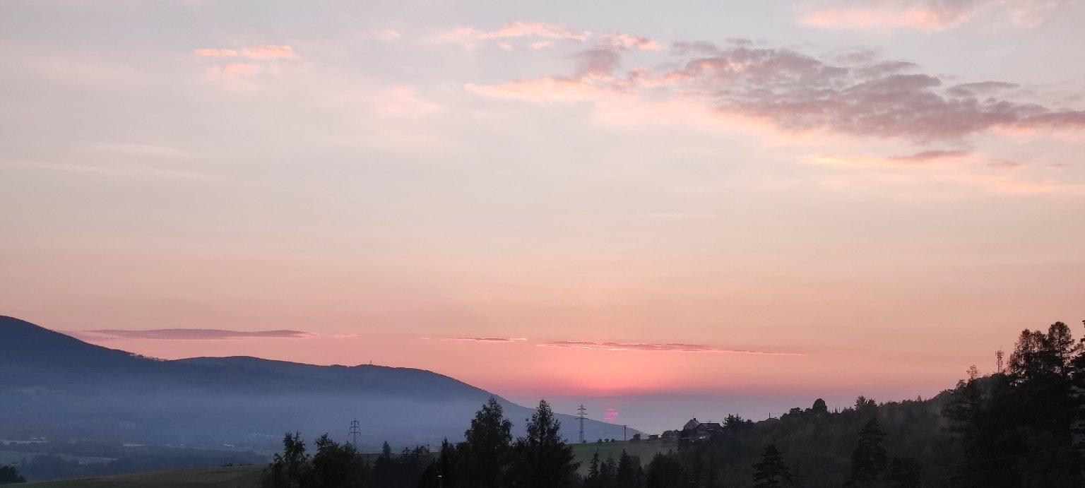 15,2°C, Oblačno. Slunce se schovává za opar.