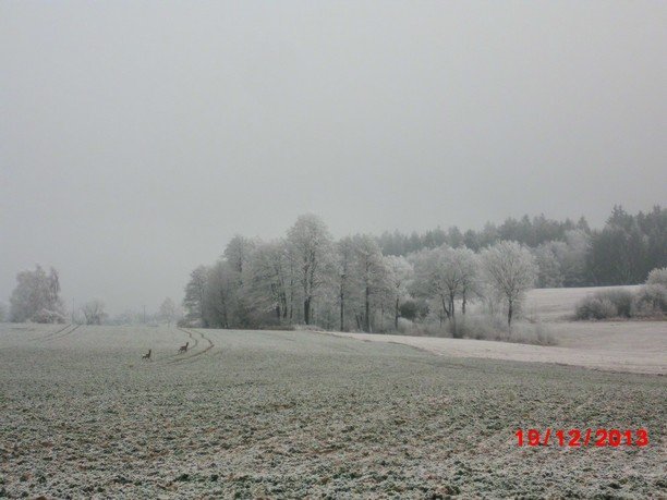 Z mlhy začíná drobně sněžit,slabý vítr,tlak 1015hPa