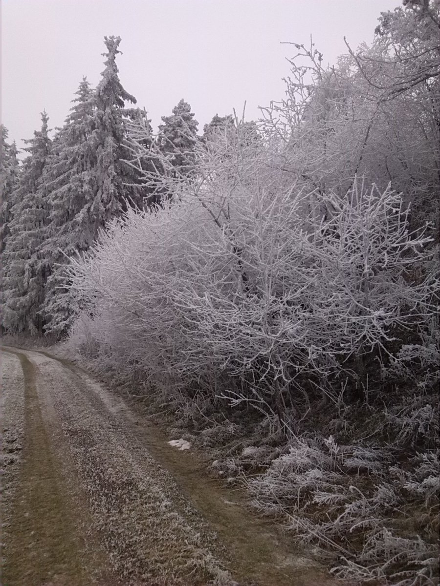 Slabý poprašek sněhu, vítr. Sluníčko místy posvítí na kopce. Ale jinak, psa bych nevyhnal. Tlak klesl 1017 hPa, vlhkost 88 %, vítr JZ 4 m/s.