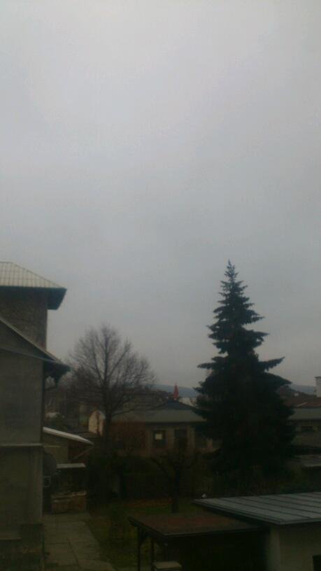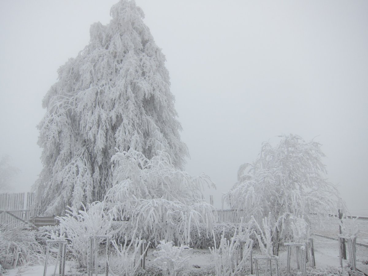 Zataženo, kouřmo, JV vítr v nárazech kolem 35 km/h. Silná námraza na stromech.