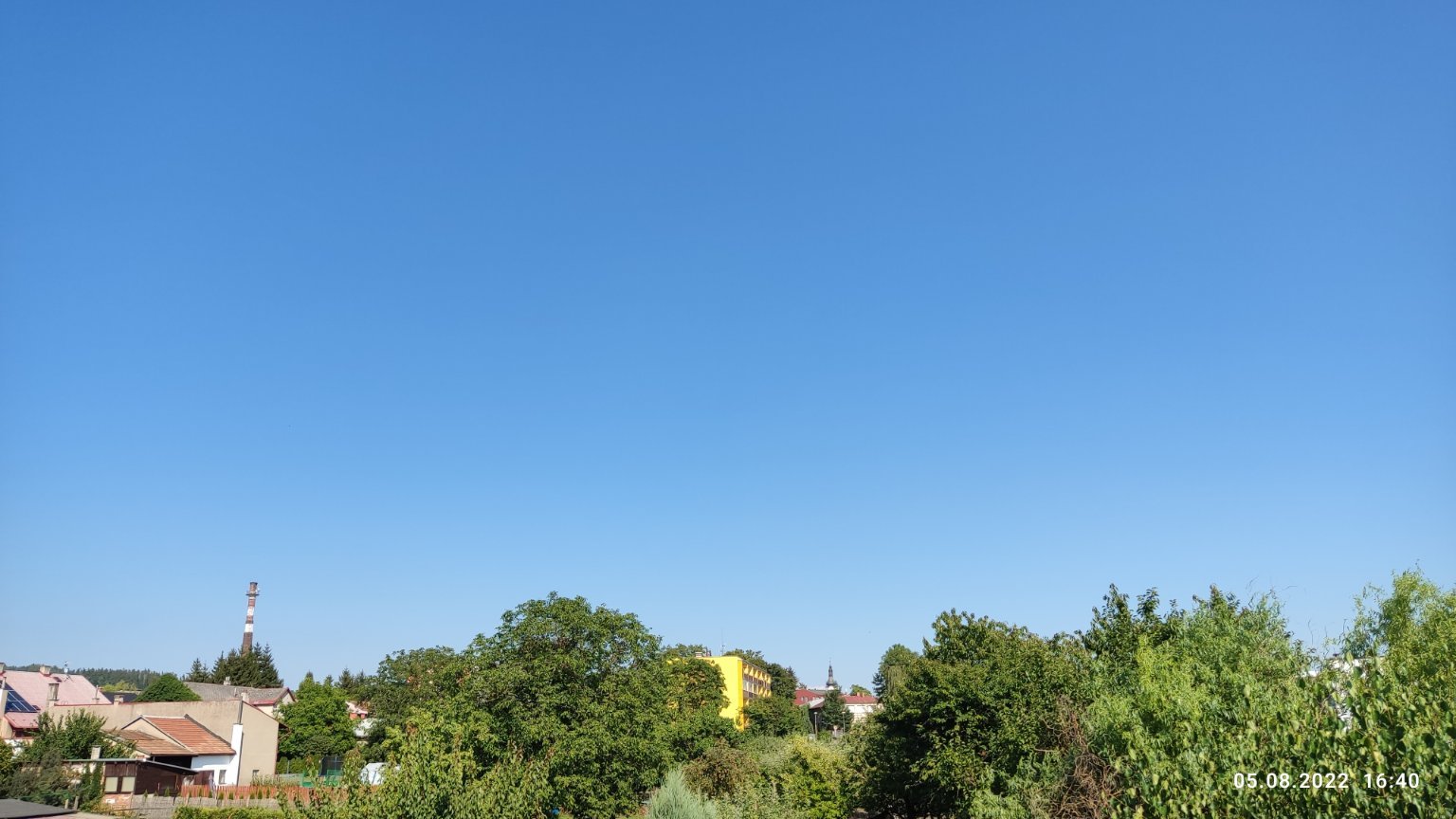 32,1°C, Jasno až skoro jasno. Vysoká teplota. Před chvílí bylo 33,3°C! Pocitově se vůbec neochladilo!