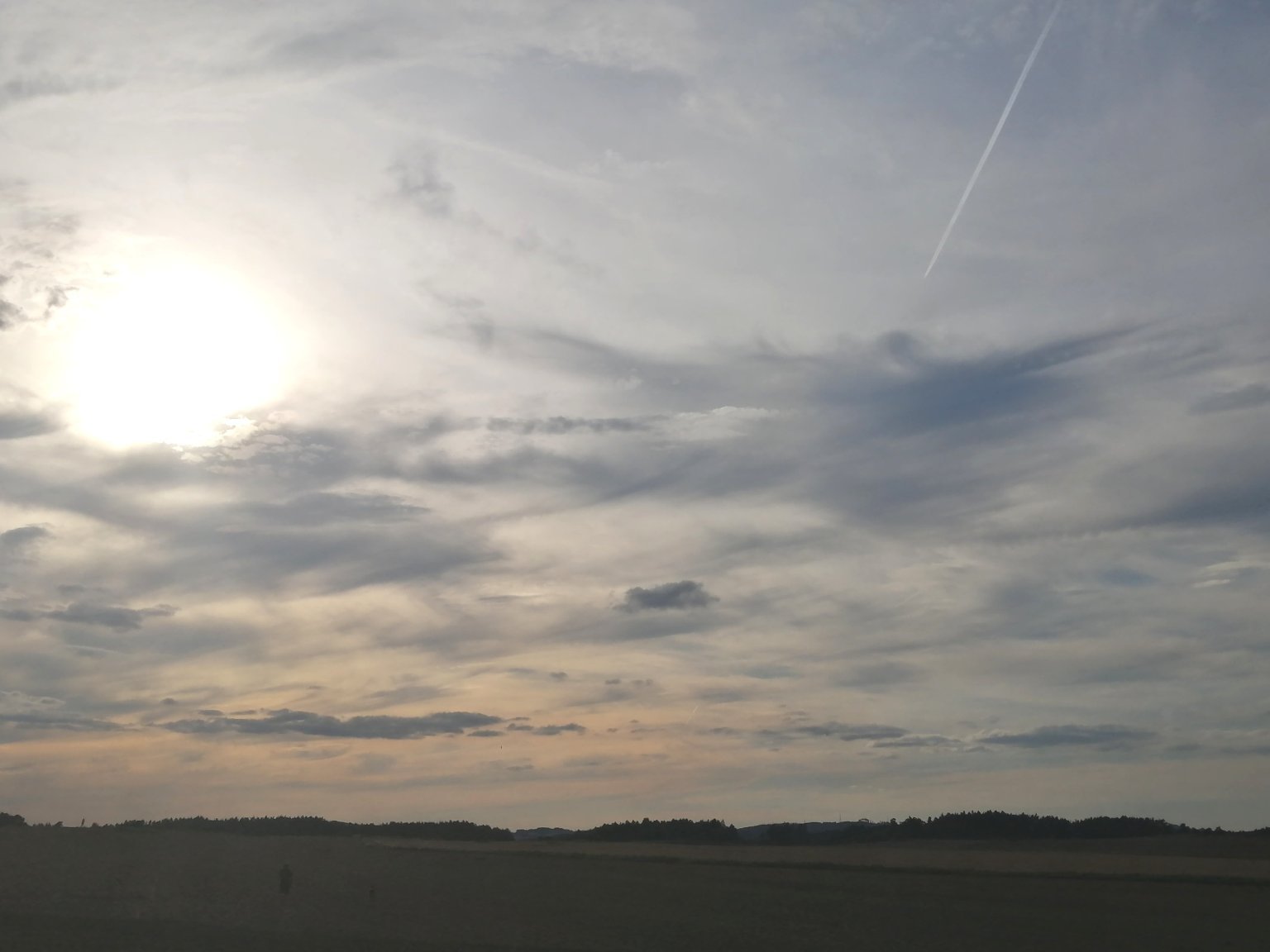 Zajímavá podvečerní oblačnost, slabý V vítr.