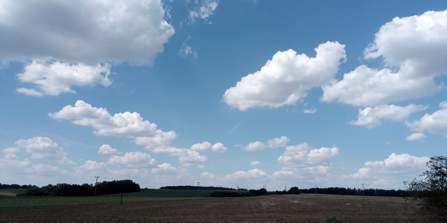 od nejmenšího k největšímu obláčku, proloženo vysokou oblačností, slunce žhne