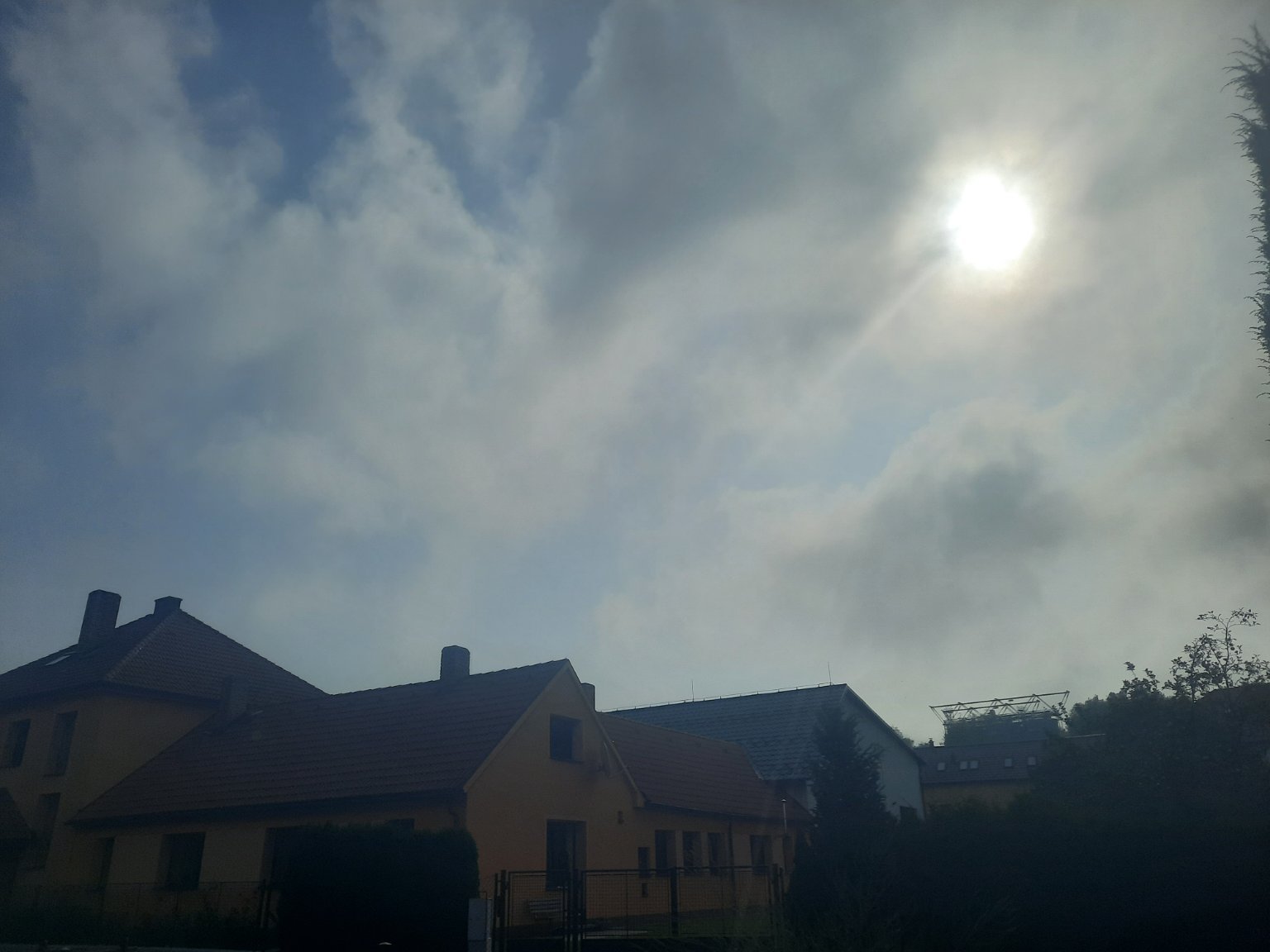 Polojasno až skoro jasno, rozpad oblačnosti. Vítr okolo 2 m/s, SZ až SV. Vlhkost 70%, tlak 1019,6hPa. Min T 17,7°C