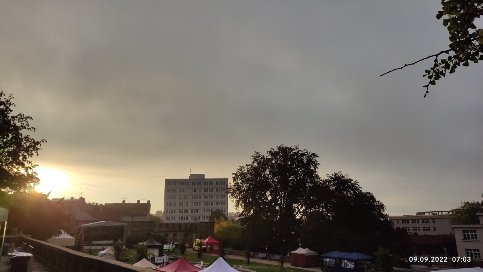 Aktuálně převažuje většinou skoro jasno+místy mlha a fouká většinou vánek, tady na nádraží mlha a o pár stovek metrů dál nic