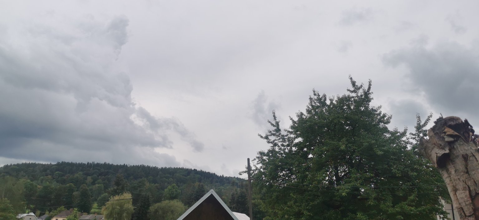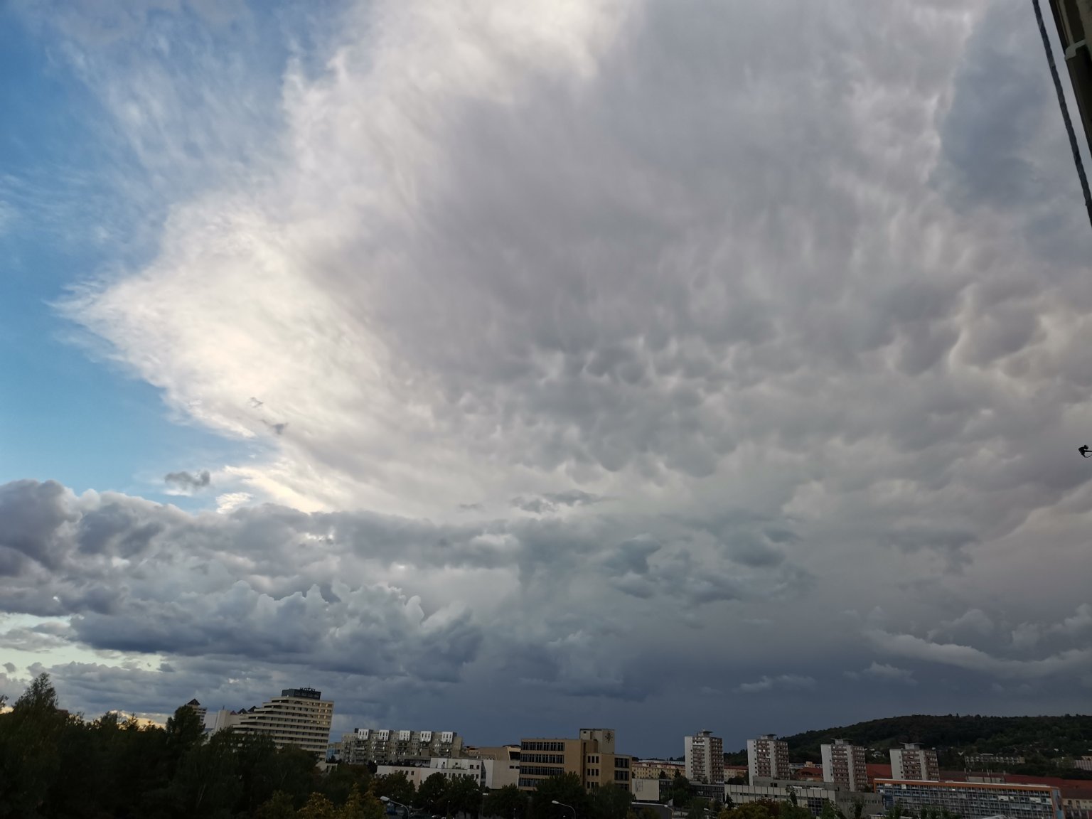 Přesně na půl. Půl oblohy modro, směrem ke KH, tmavo. Zatím beze srážek