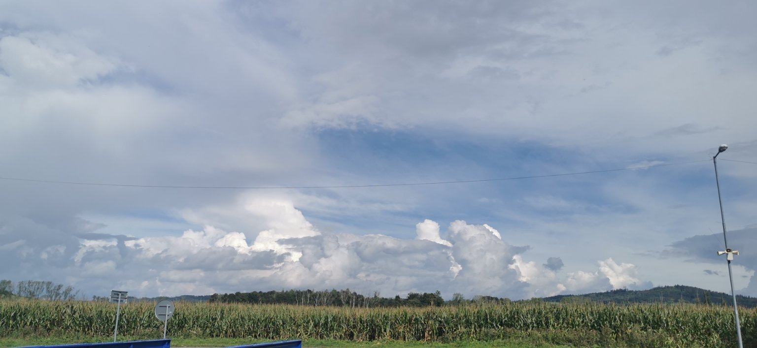 Poměrně vydatná přeháňka, tlak 1013,3 hPa, SZZ vítr do 4 m/s. Další výrazná (zřejmě bouřková) oblačnost se přibližuje od Z, SZ.