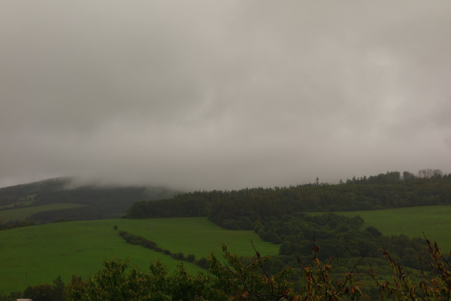 9,5°C, Zataženo. Blíží se přeháňka, ale není na radaru, asi to bude mrholení. Rozfoukalo se a je zima.
