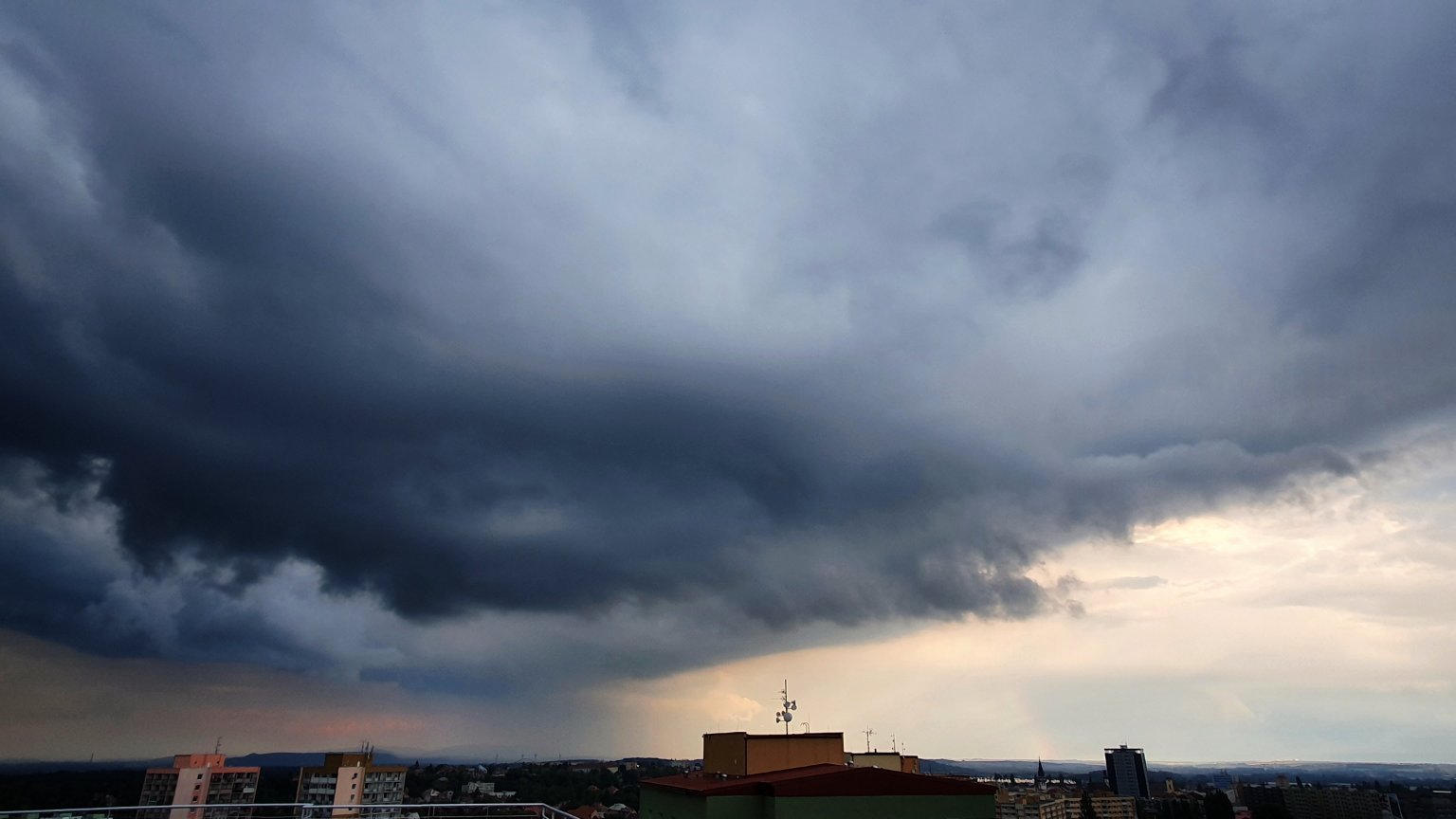 Aktuálně: Slunce zapadá, vzdálená bouřka na jihu. Teplota: 15.8°C, Vlhkost: 82%, Tlak: 1010 hPa.