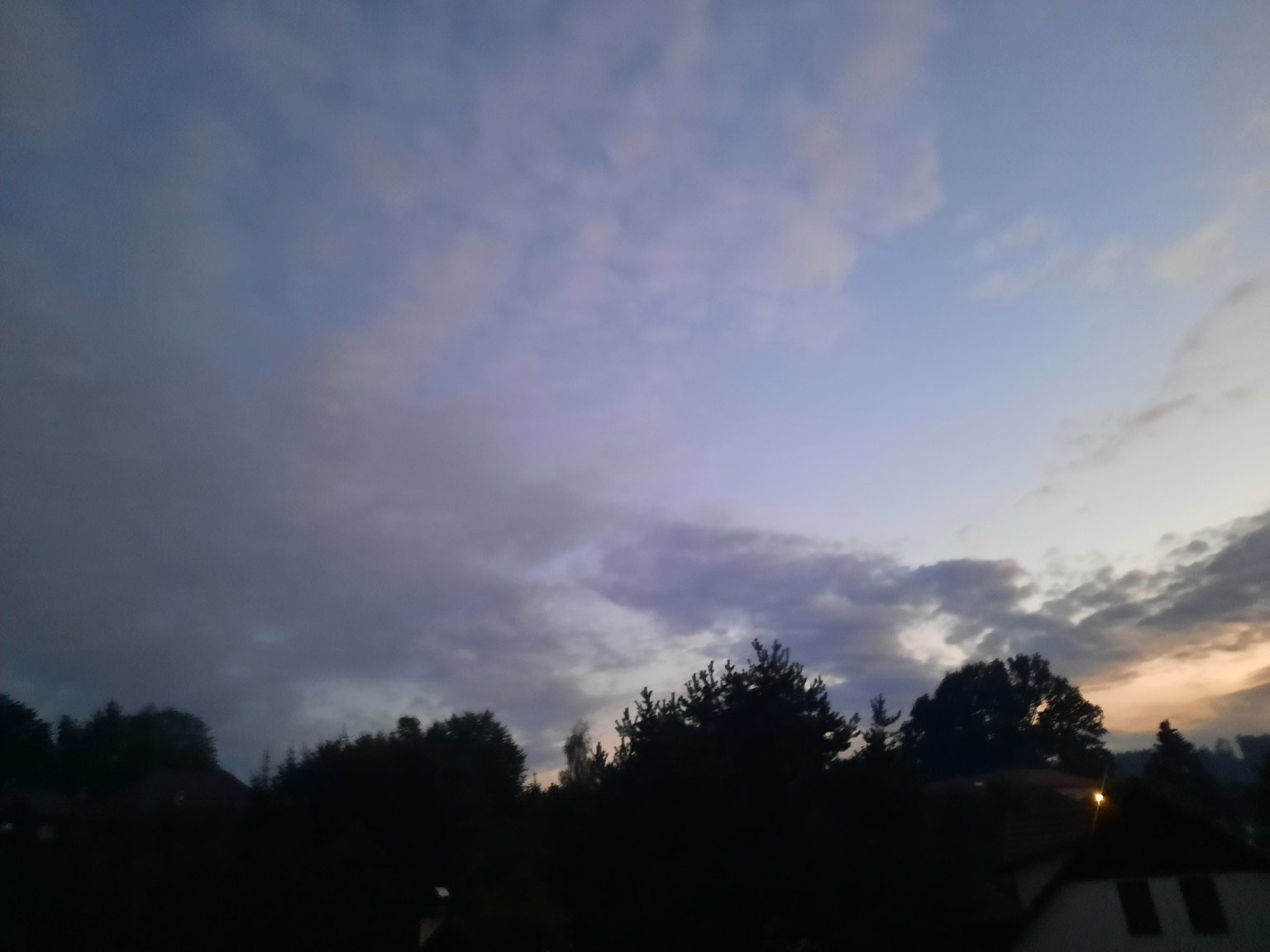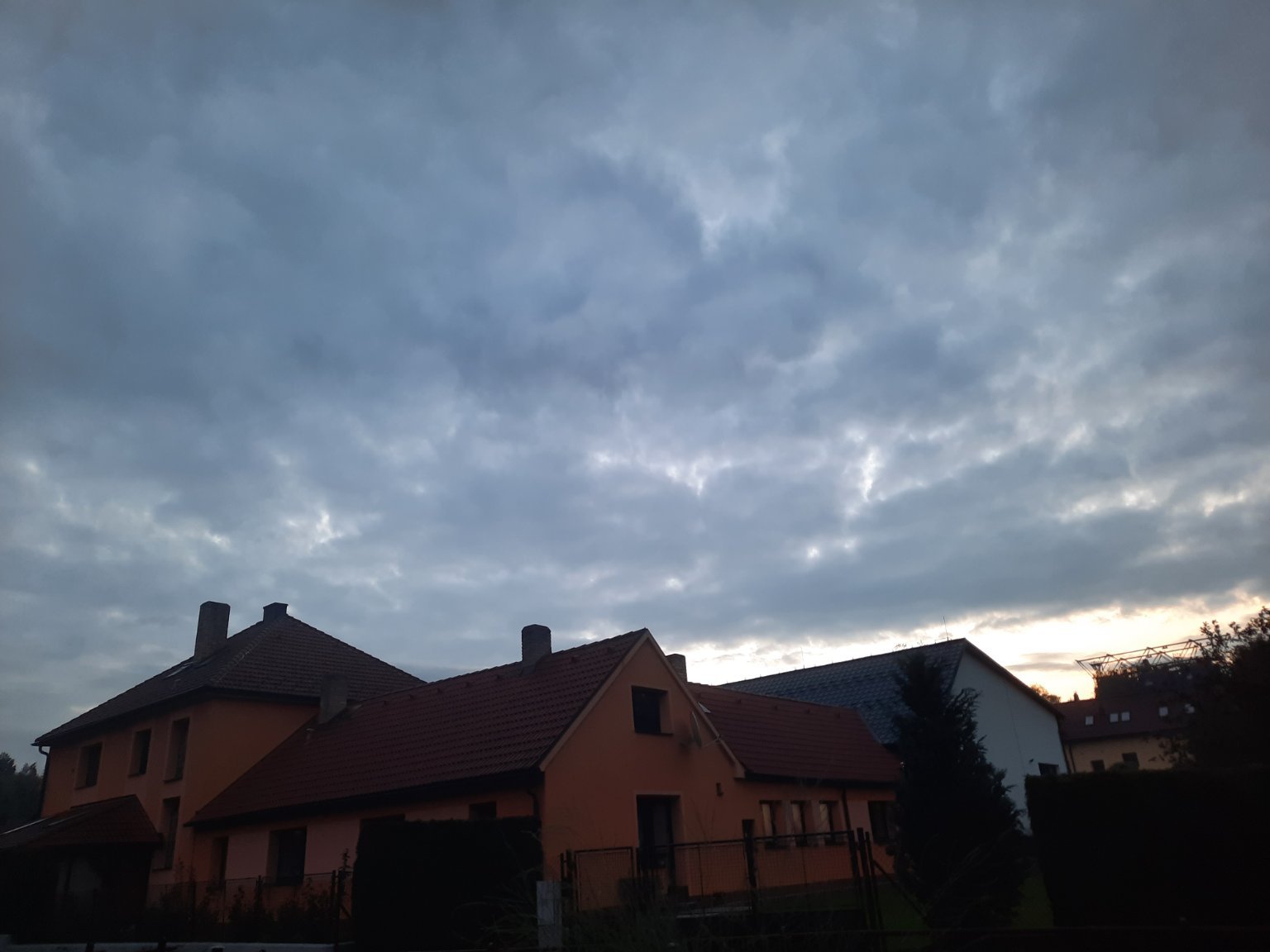 Oblačno 6/8, rozpad oblačnosti. Po bouřce s přeháňkou. Vítr 1,7 m/s S. Vlhkost 92%. Tlak 1010,5hPa. Srážky dnes 2,3 mm. Max T 20,4°C