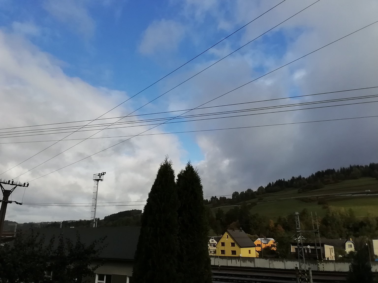 Proměnlivá, velká oblačnost. Občas velmi slabá přeháňka. Úhrn zatím 0,3 mm. Vítr 2 m/s proměnlivý. Vlhkost 85%. Tlak 1022,6hPa. Min T dnes 10,5°C