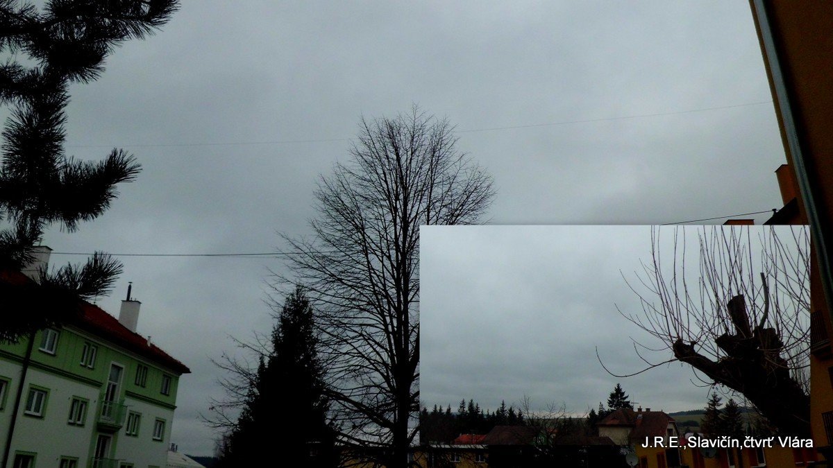 Z rána mlha, oblačnost 6/8. Tlak 1022.2 hPa, vlhkost 98%, vítr do 1 m/s-JZ, rosný bod 3.2°C, pocitová teplota 3.5°C, beze srážek. Foto pořízeno v 15.18 hod.