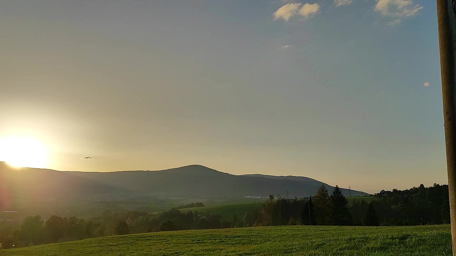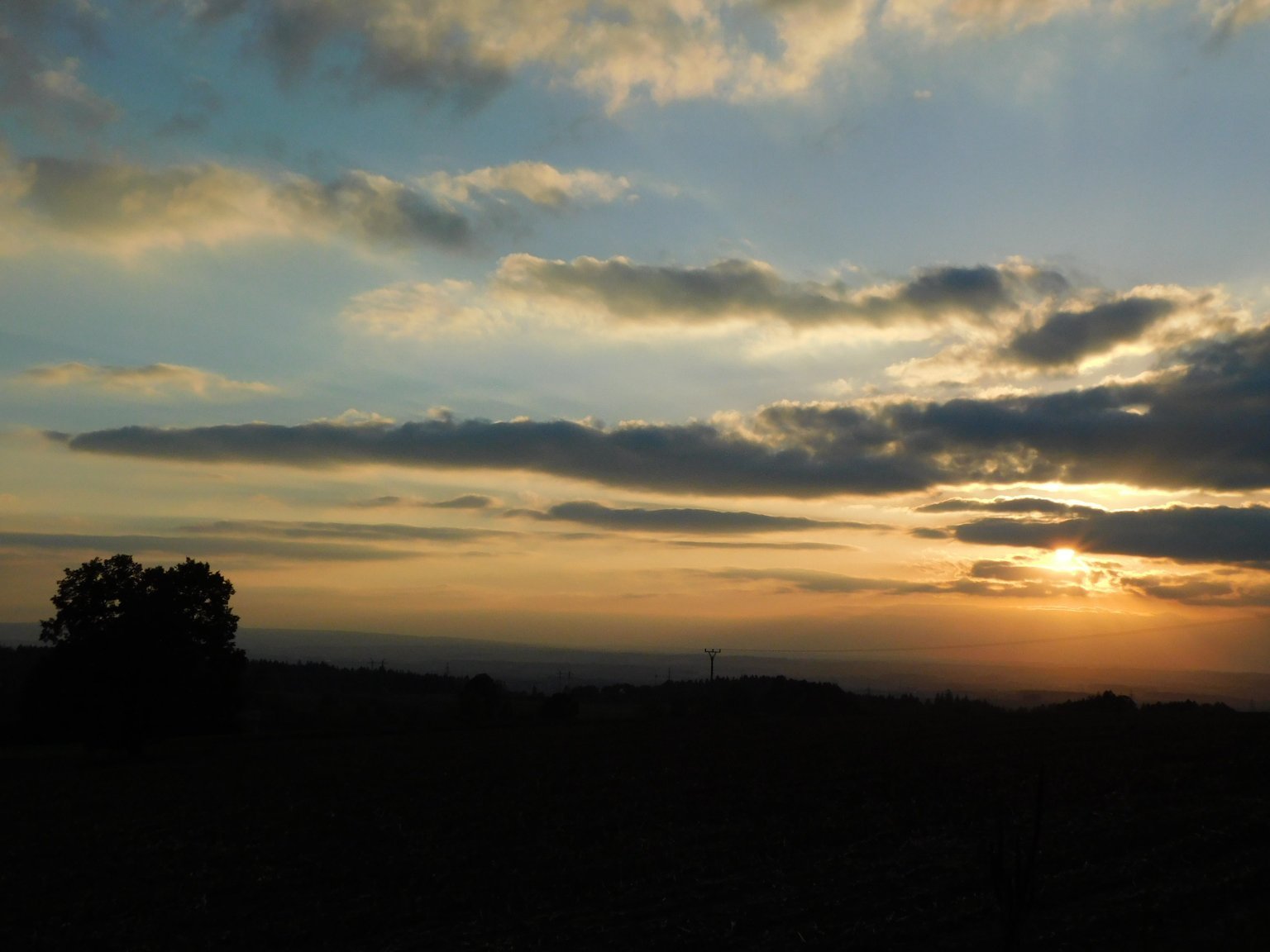 15,7°C, Skoro jasno až jasno. Nádherný západ slunce s krajinou.