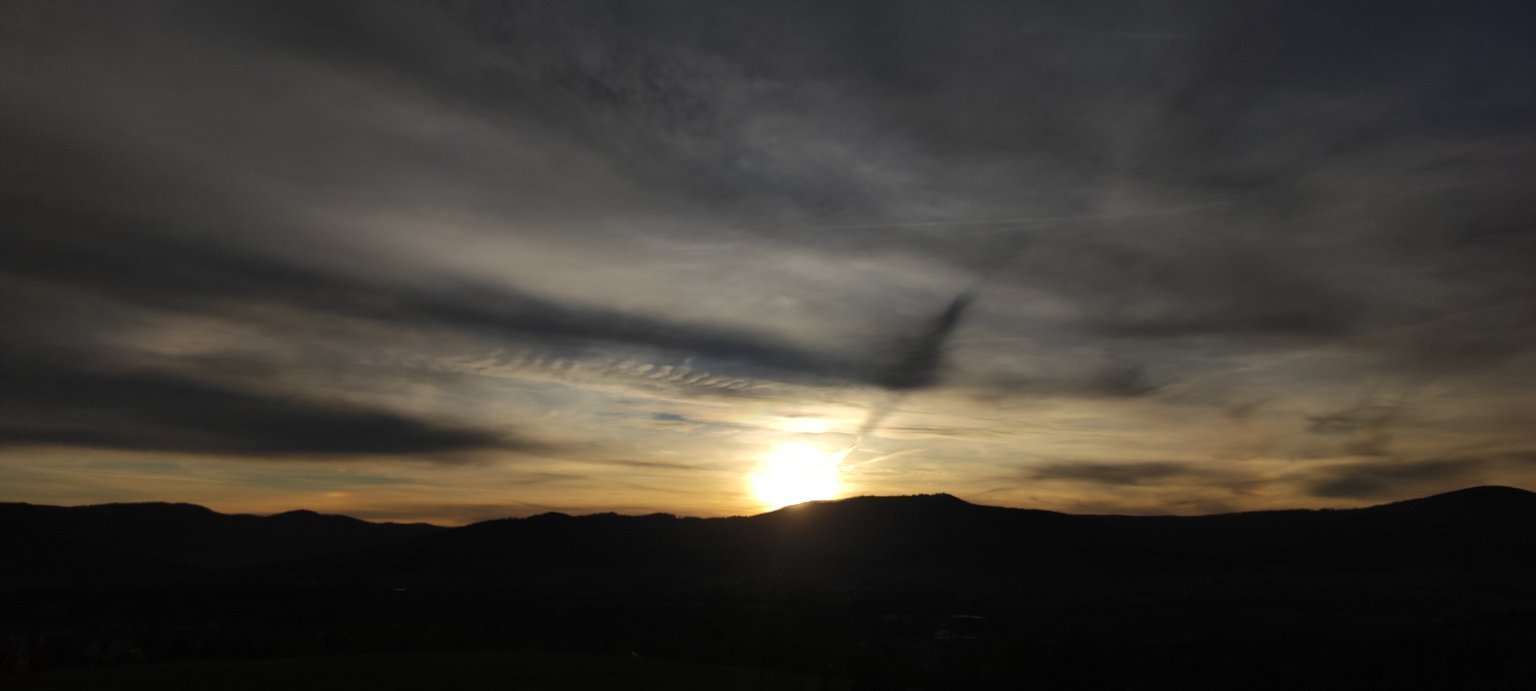 Nízká oblačnost v Podkrušnohoří, z Klínů v Krušných horách. V pozadí Loučná, 956 m.n.m.