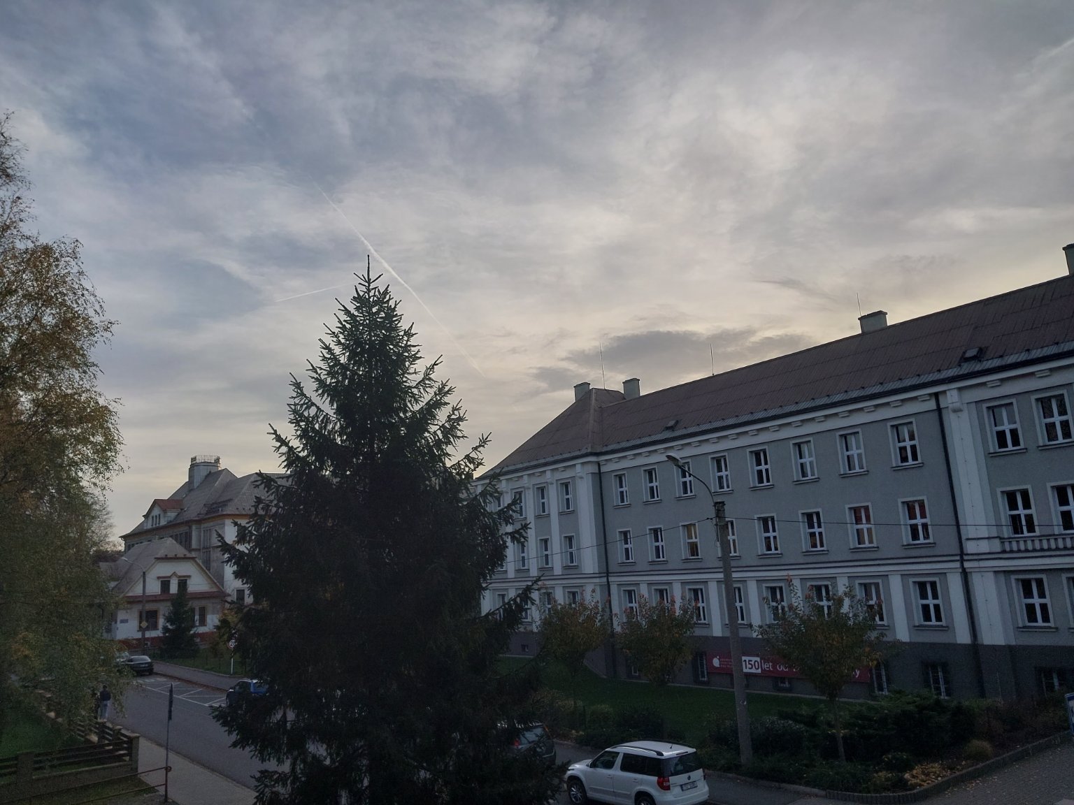 Po celý den zataženo nízkou oblačností, tlak 1020,6 hPa, slabý JJZ vítr.