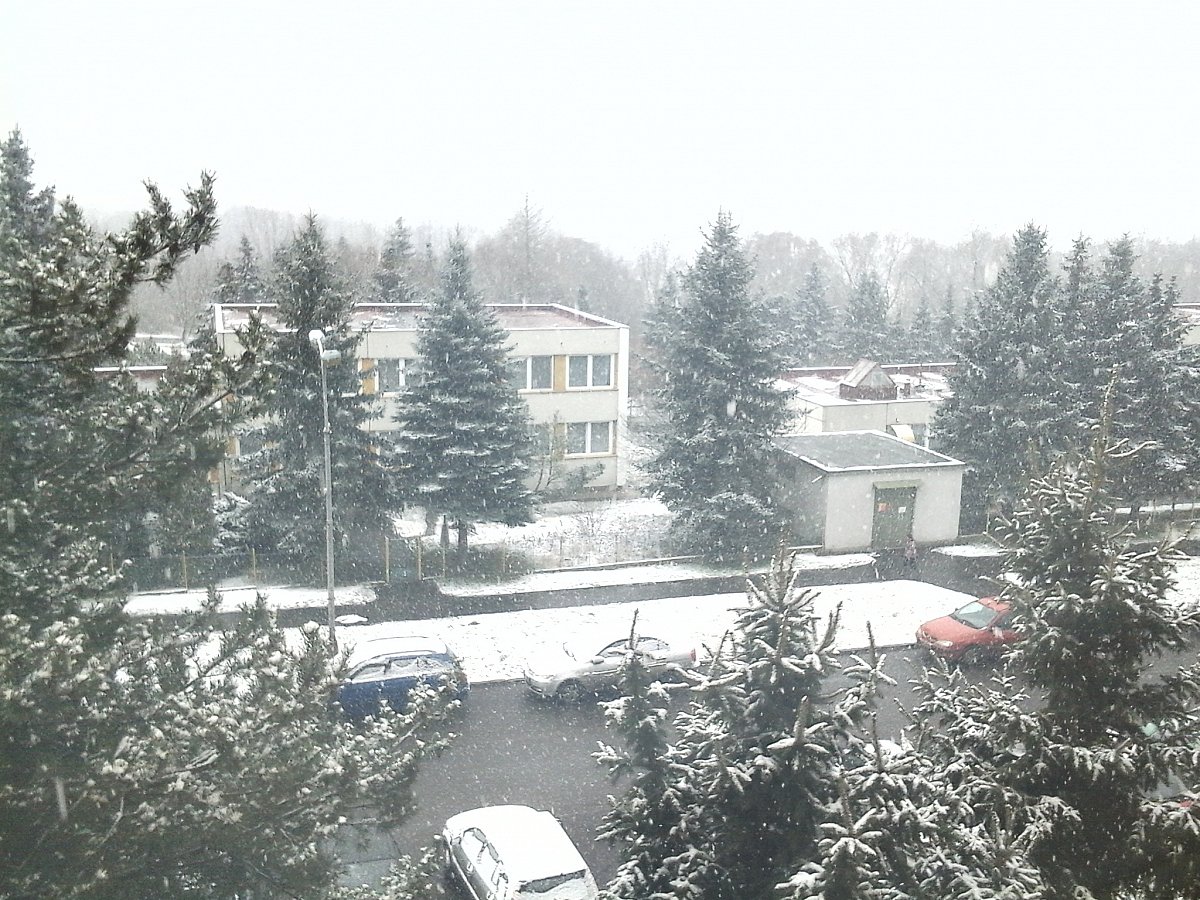 Slabý vítr,občas poletuje sníh,tlak 1010hPa,vlhkost 75%.U nás jen trochu "pocukrováno"...