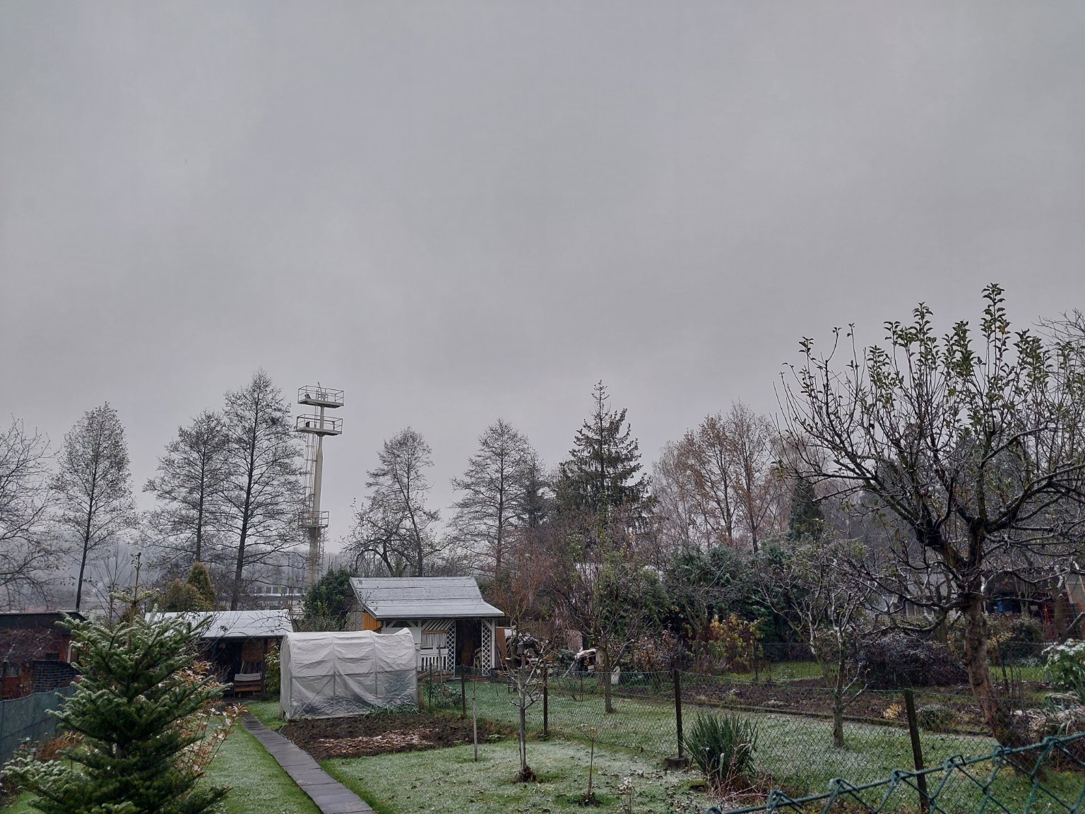 -0,3°C, Mírne sněženi, Sníh: poprašek. Sníh se drži, mrzne.