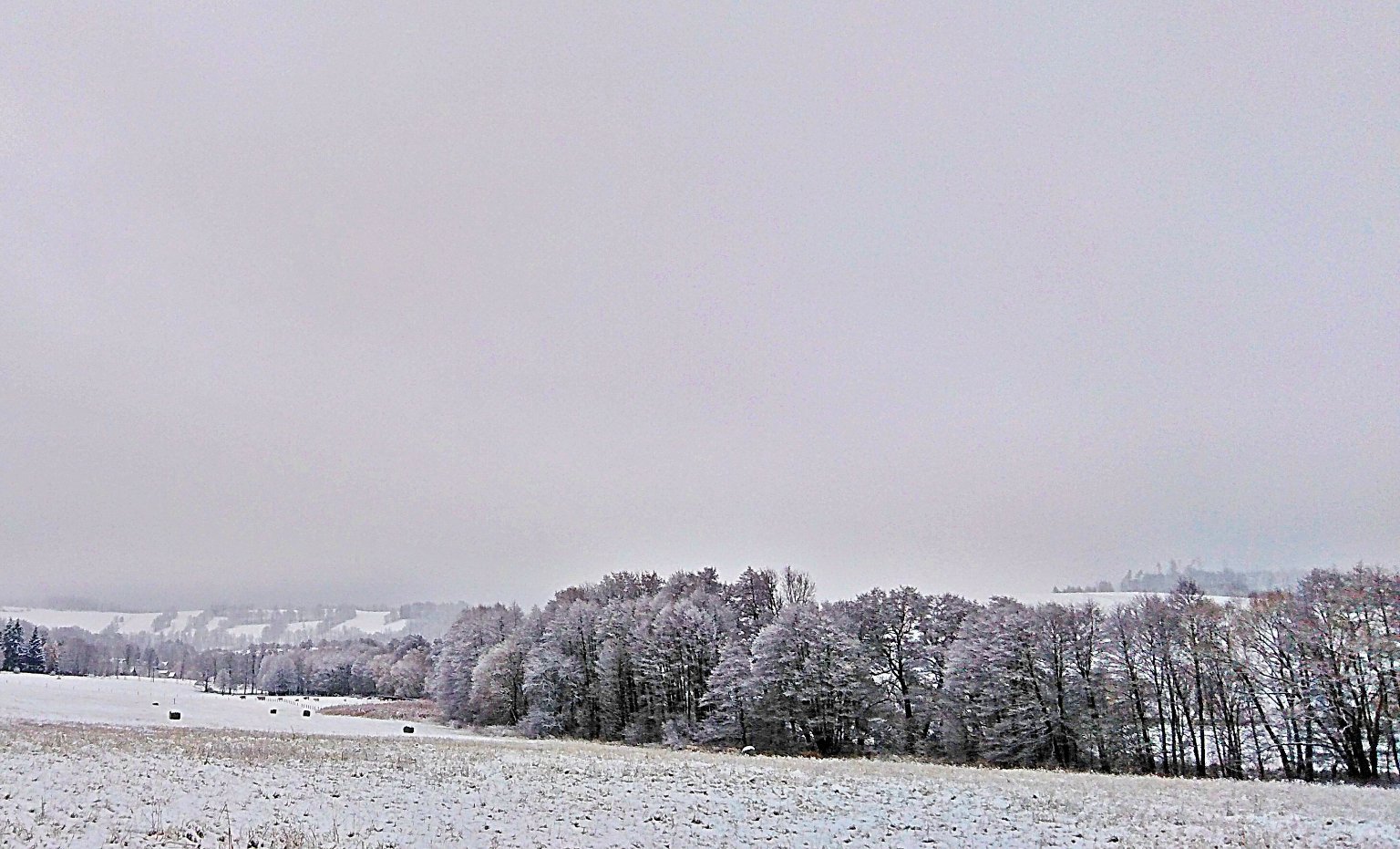 -0,5°C, Mírne až silné sněženi, Sníh: 0,9 cm. Už máme kolem 1 cm sněhu.