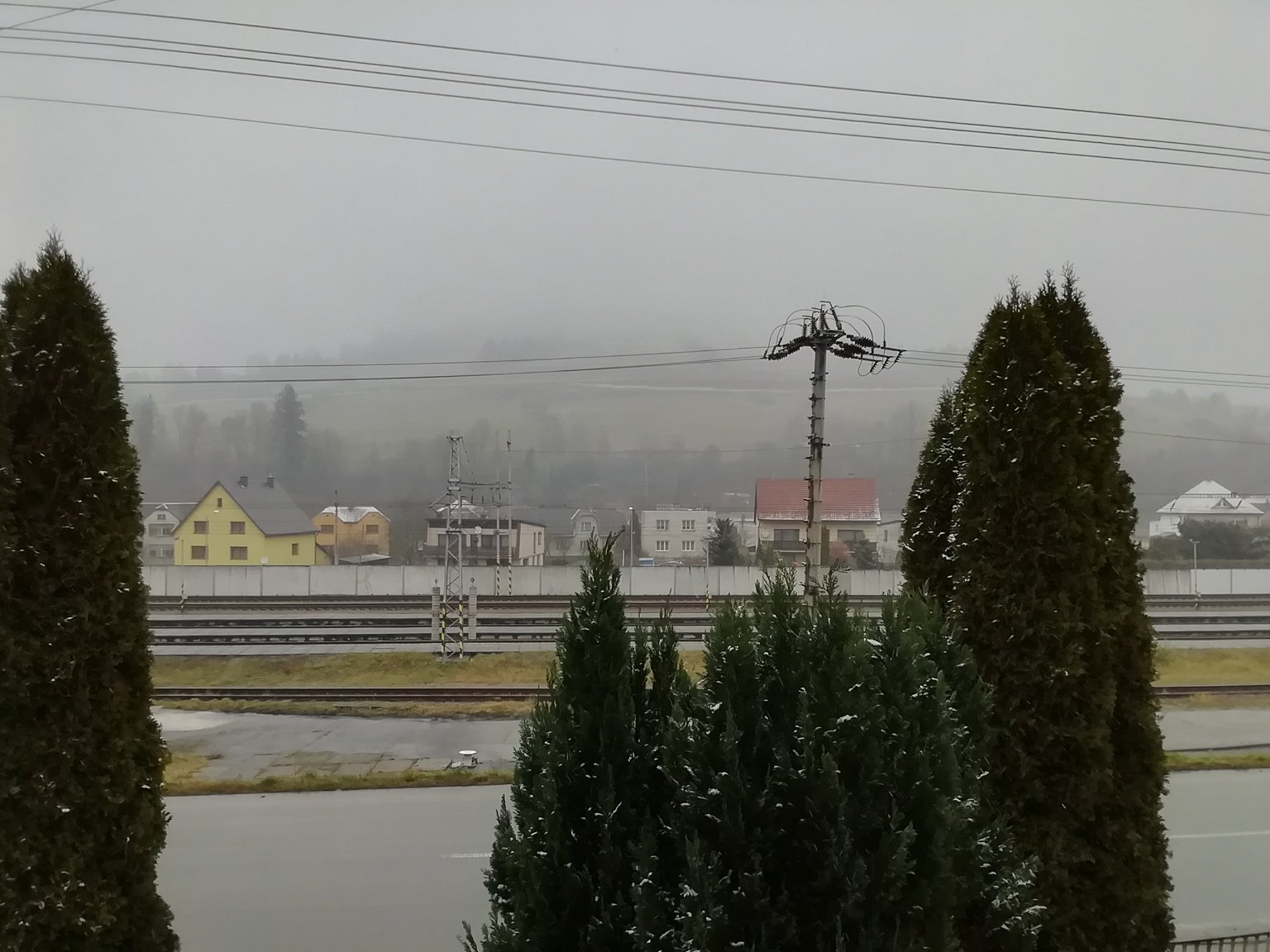 -°C, Zanedbatelné až velmi slabé sněženi, Sníh: 0 cm. Před chvílí chumelilo, ale poprašek na střeše už roztál...