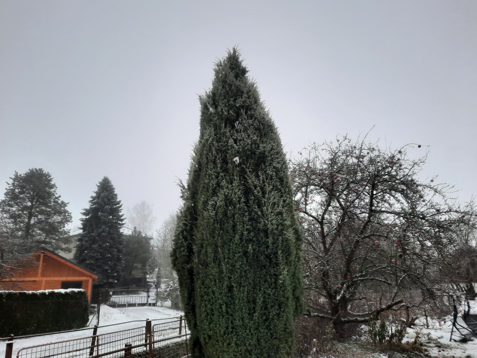 -0,1°C, Mírná až silná mlha, Sníh: 9 cm. Stromy stále hezky obalené sněhem.