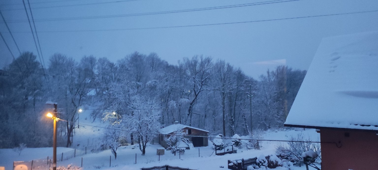 Aktuálně převažuje většinou zataženo až skoro zataženo a slabé sněžení a fouká většinou slabý vítr