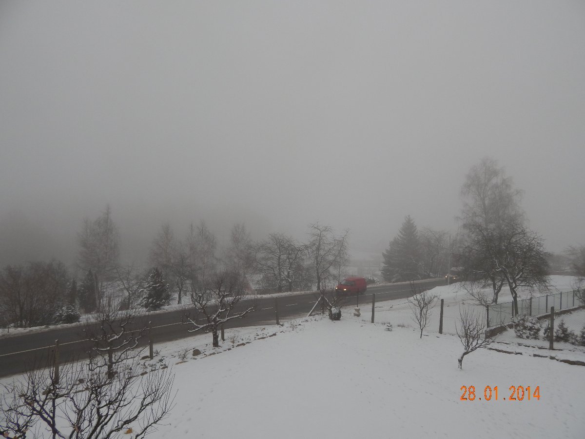 Oblačnost 81,3%, zákl.mraků 583m, mlhavo, tlak 1002,7hPa, dohlednost 3km, vlhkost 96,4%, SSV vánek 19° 1,5m/s(1 Bft).