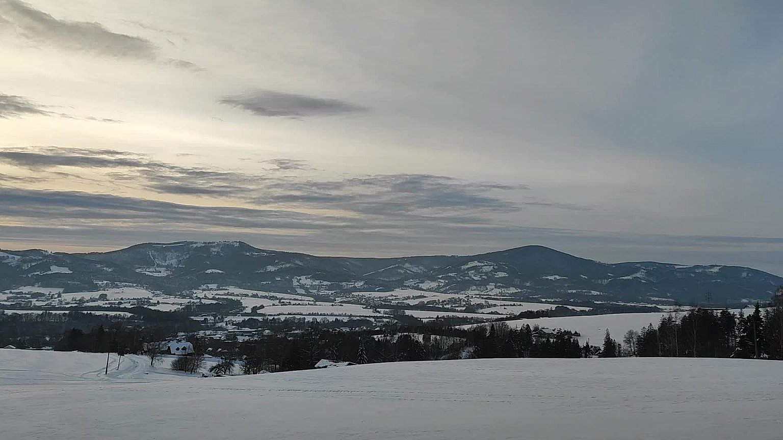 mrznoucí mlha, občas drobné sněžení, slabý až mírný vítr za městem se tvoří místy sněhové jazyky, námraza, -4°C