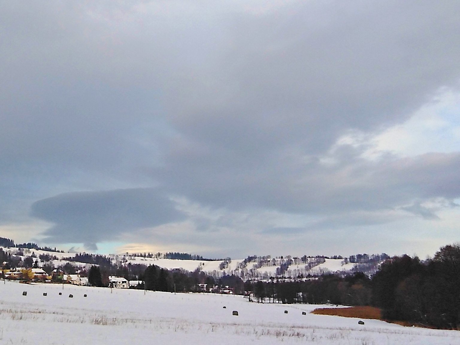 Sníh už ubývá. Vítr JV 6,1 km/hod. Už je nad nulou. Ještě trochu mlhy a bude hezky.