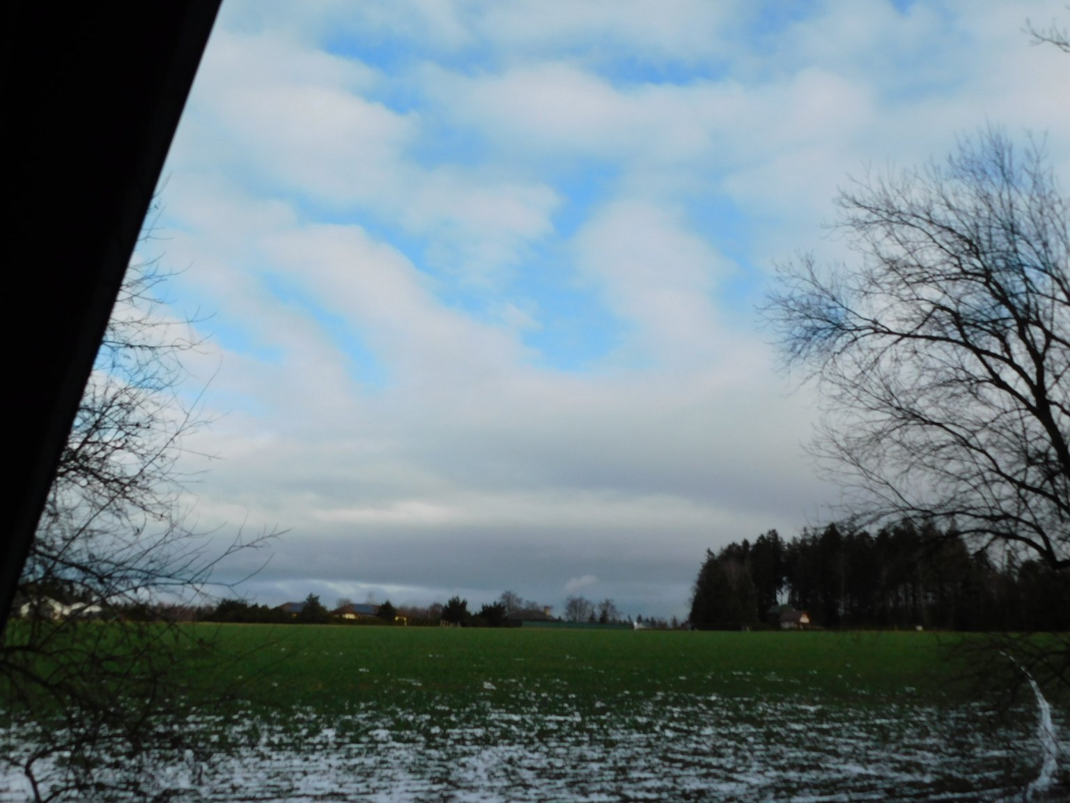 Polooblačno, větrno, tady u lesa ještě souvislá sněhová pokrývka