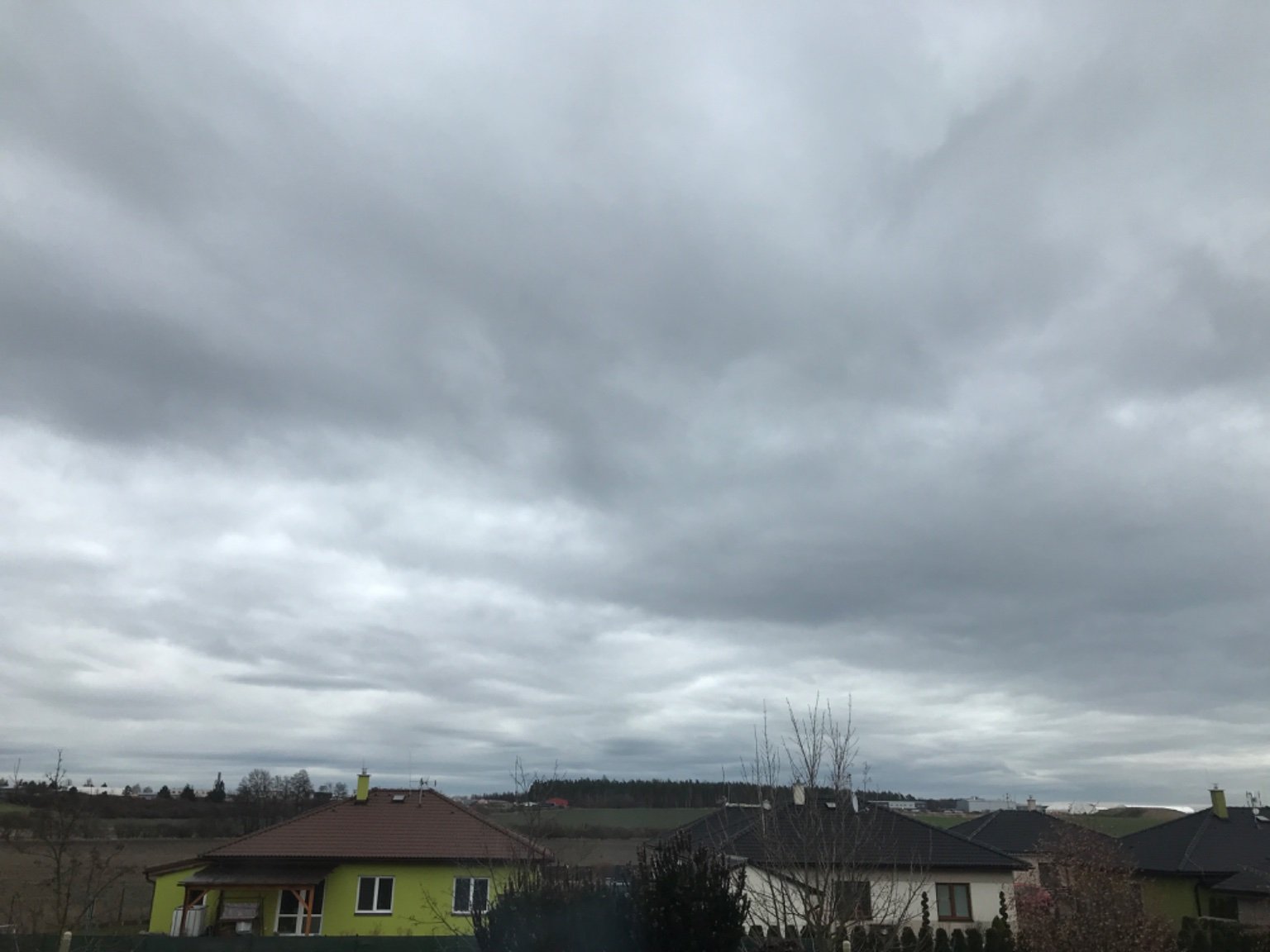 Vlhkost 62%, vítr čerstvý JV, 8,9 m/s, v nárazech až prudký, 15,2 m/s. Pocitová teplota -0,2°C. Zataženo, krupkový déšť.