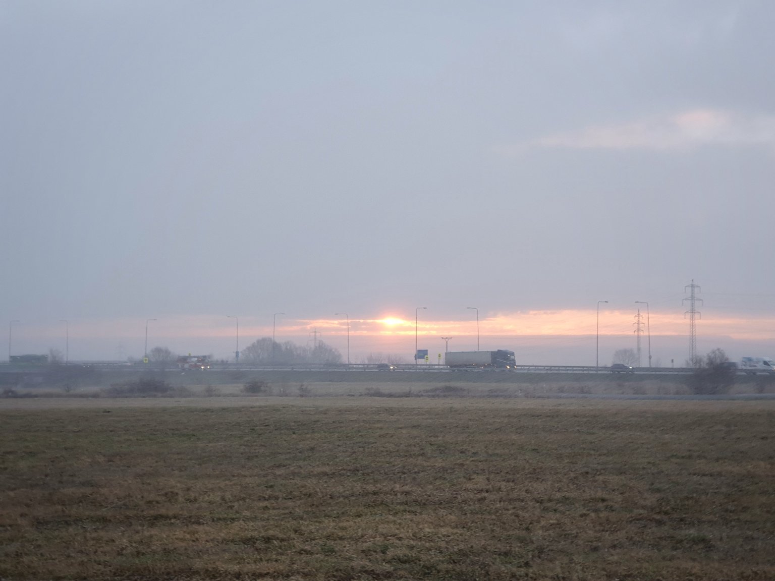 Nízká oblačnost, slabá mlha, tlak 992,3 hPa (setrvalý stav nebo slabý pokles), slabý J vítr.